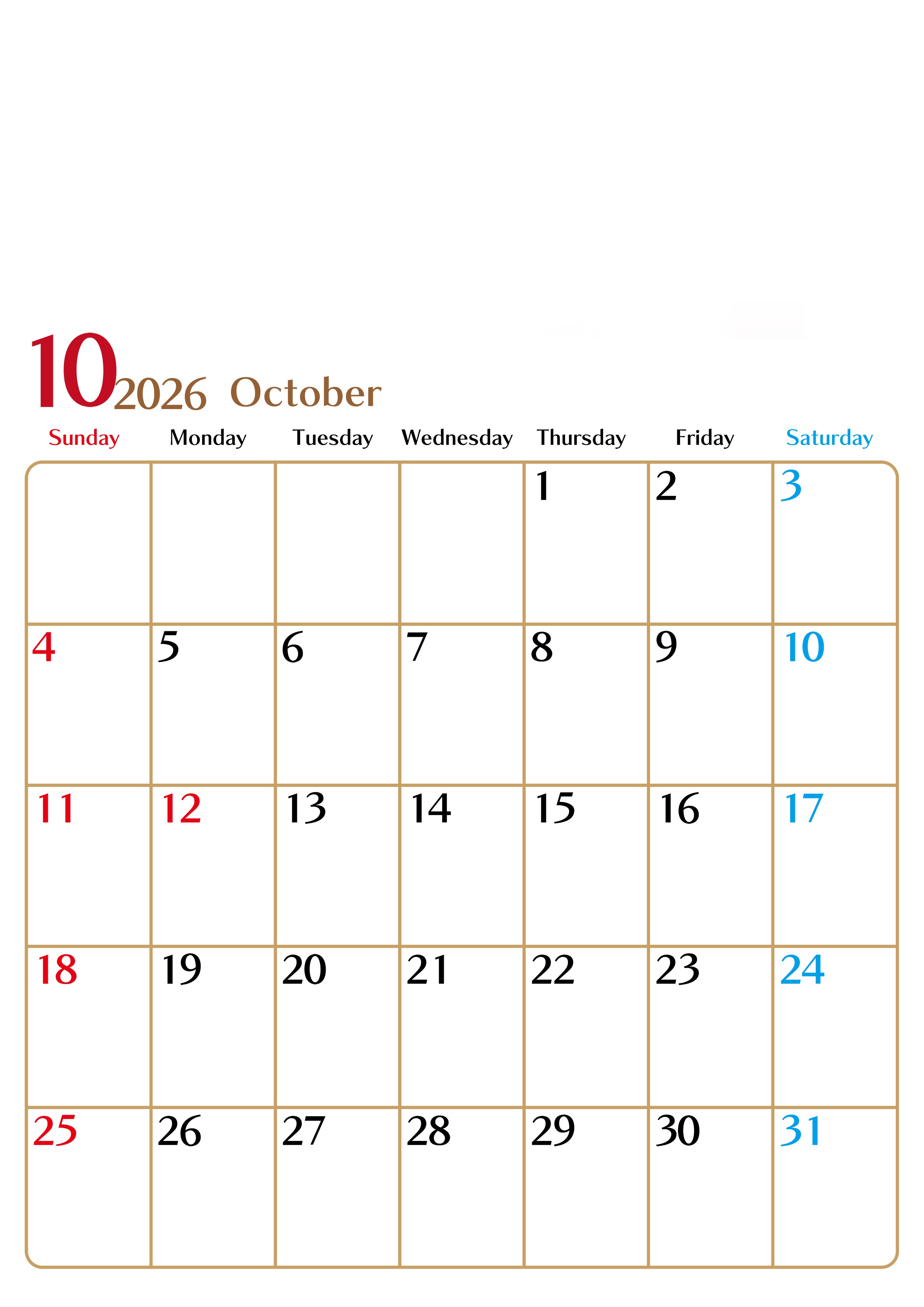 2026年・無料のカレンダーテンプレート 2026年10月縦型の日曜始まりカレンダー♪シンプルで書き込みしやすい文字が大きなA4用紙向け(無料)(2026-01171010) 素材状デザイン王 2025年4月8日 2026年10月縦型の日曜始まりの書き込みしやすい文字が大きなA4用紙向け(無料)です。予定を見える化するのに向いているのでダウンロードをおすすめ!計画を立てるのに最適です。(2026-01171010) シンプル 10月 縦型のカレンダー 日曜始まり カレンダーデザイン-0117