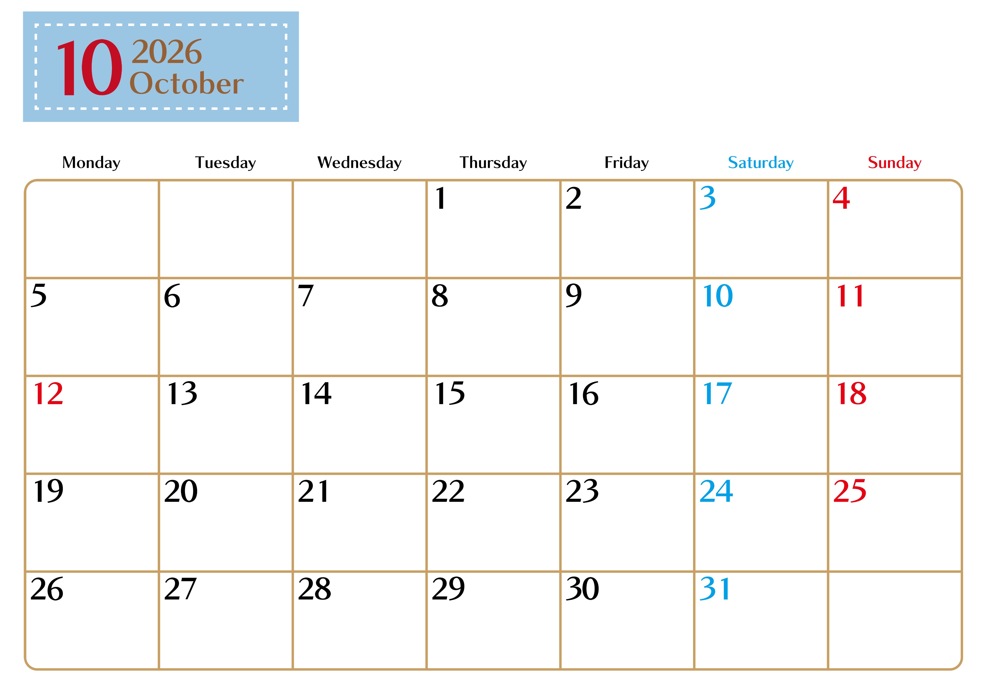 2026年・無料のカレンダーテンプレート 2026年10月横型の月曜始まりカレンダー♪シンプルで書き込みしやすい文字が大きなA4用紙向け(無料)(2026-01171001) 素材状デザイン王 2025年4月8日 2026年10月横型の月曜始まりの書き込みしやすい文字が大きなA4用紙向け(無料)です。予定を見える化するのに向いているのでダウンロードをおすすめ!計画を立てるのに最適です。(2026-01171001) シンプル 10月 横型のカレンダー 月曜始まり カレンダーデザイン-0117