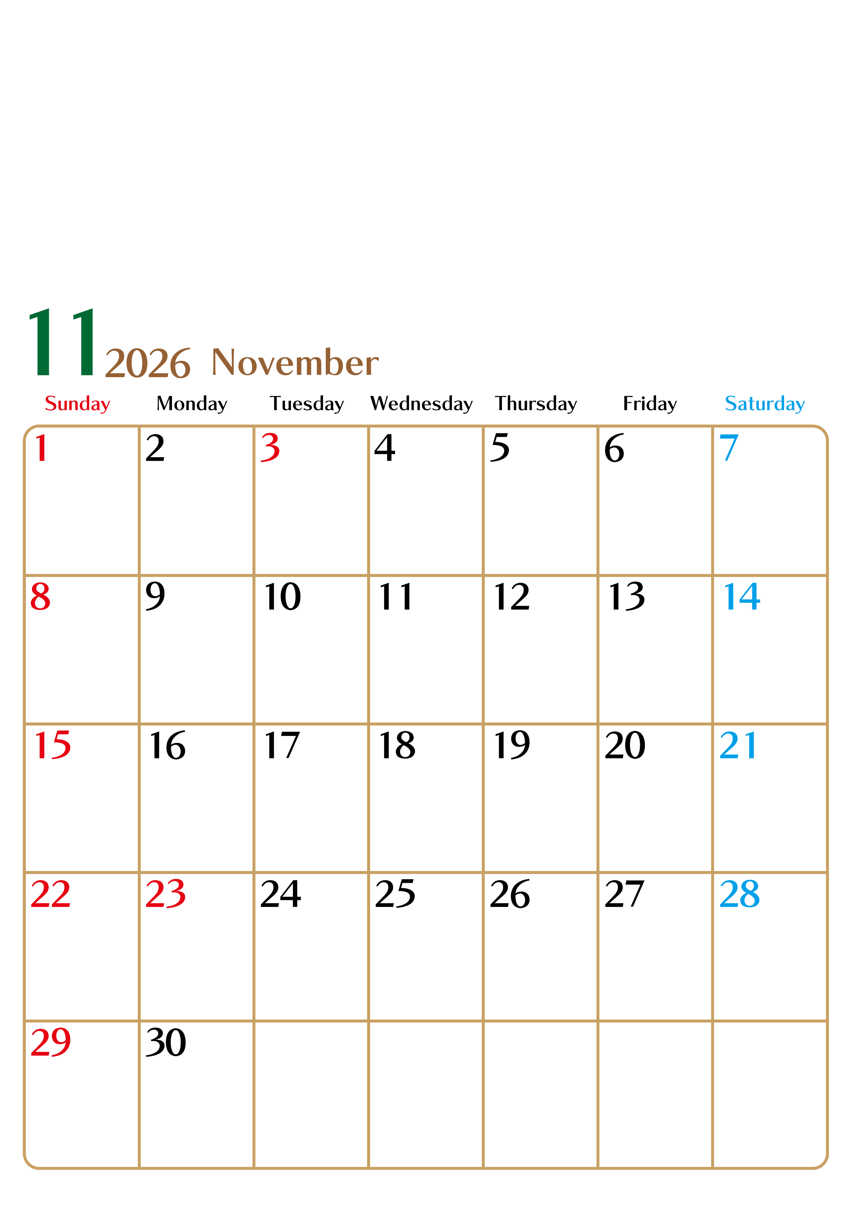 2026年・無料のカレンダーテンプレート 2026年11月縦型の日曜始まりカレンダー♪シンプルで書き込みしやすい文字が大きなA4用紙向け(無料)(2026-01171110) 素材状デザイン王 2025年4月8日 2026年11月縦型の日曜始まりの書き込みしやすい文字が大きなA4用紙向け(無料)です。予定を見える化するのに向いているのでダウンロードをおすすめ!スケジュールを管理しやすいです。(2026-01171110) シンプル 11月 縦型のカレンダー 日曜始まり カレンダーデザイン-0117