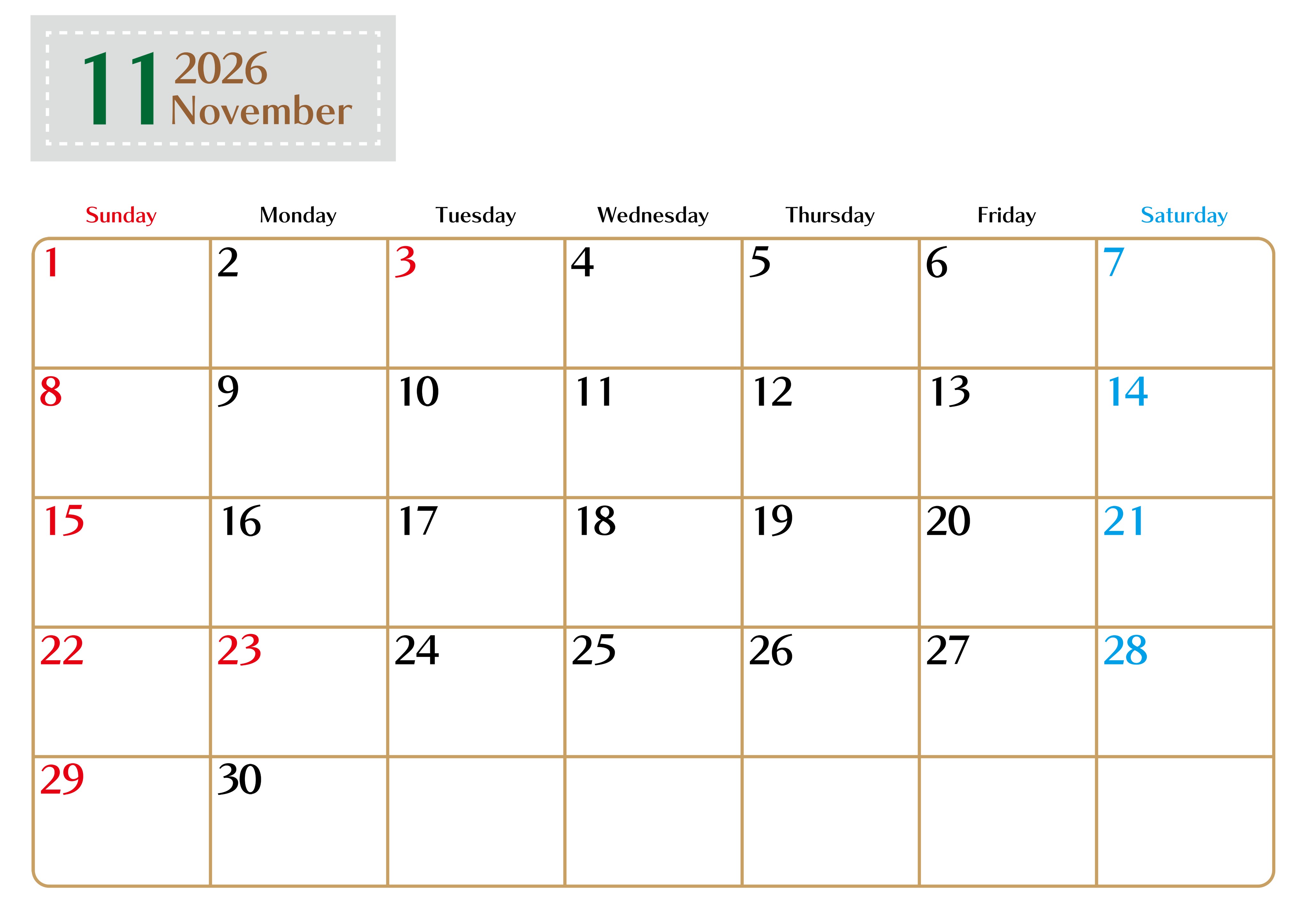2026年・無料のカレンダーテンプレート 2026年11月横型の日曜始まりカレンダー♪シンプルで書き込みしやすい文字が大きなA4用紙向け(無料)(2026-01171100) 素材状デザイン王 2025年4月8日 2026年11月横型の日曜始まりの書き込みしやすい文字が大きなA4用紙向け(無料)です。予定を見える化するのに向いているのでダウンロードをおすすめ!スケジュールを管理しやすいです。(2026-01171100) シンプル 11月 横型のカレンダー 日曜始まり カレンダーデザイン-0117