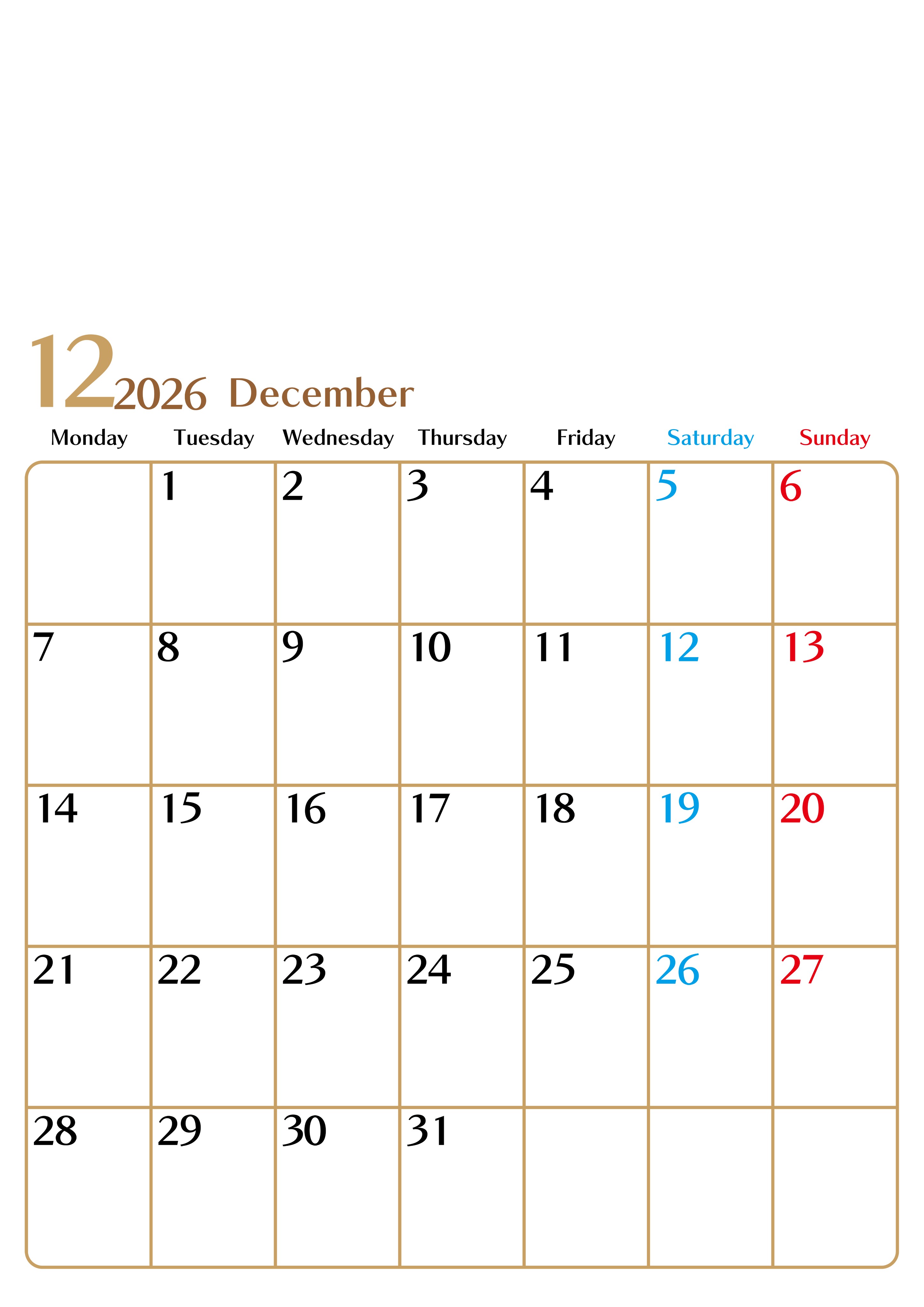 2026年・無料のカレンダーテンプレート 2026年12月縦型の月曜始まりカレンダー♪シンプルで書き込みしやすい文字が大きなA4用紙向け(無料)(2026-01171211) 素材状デザイン王 2025年4月8日 2026年12月縦型の月曜始まりの書き込みしやすい文字が大きなA4用紙向け(無料)です。予定を見える化するのに向いているのでダウンロードをおすすめ!プランの整理にぴったりです。(2026-01171211) シンプル 12月 縦型のカレンダー 月曜始まり カレンダーデザイン-0117
