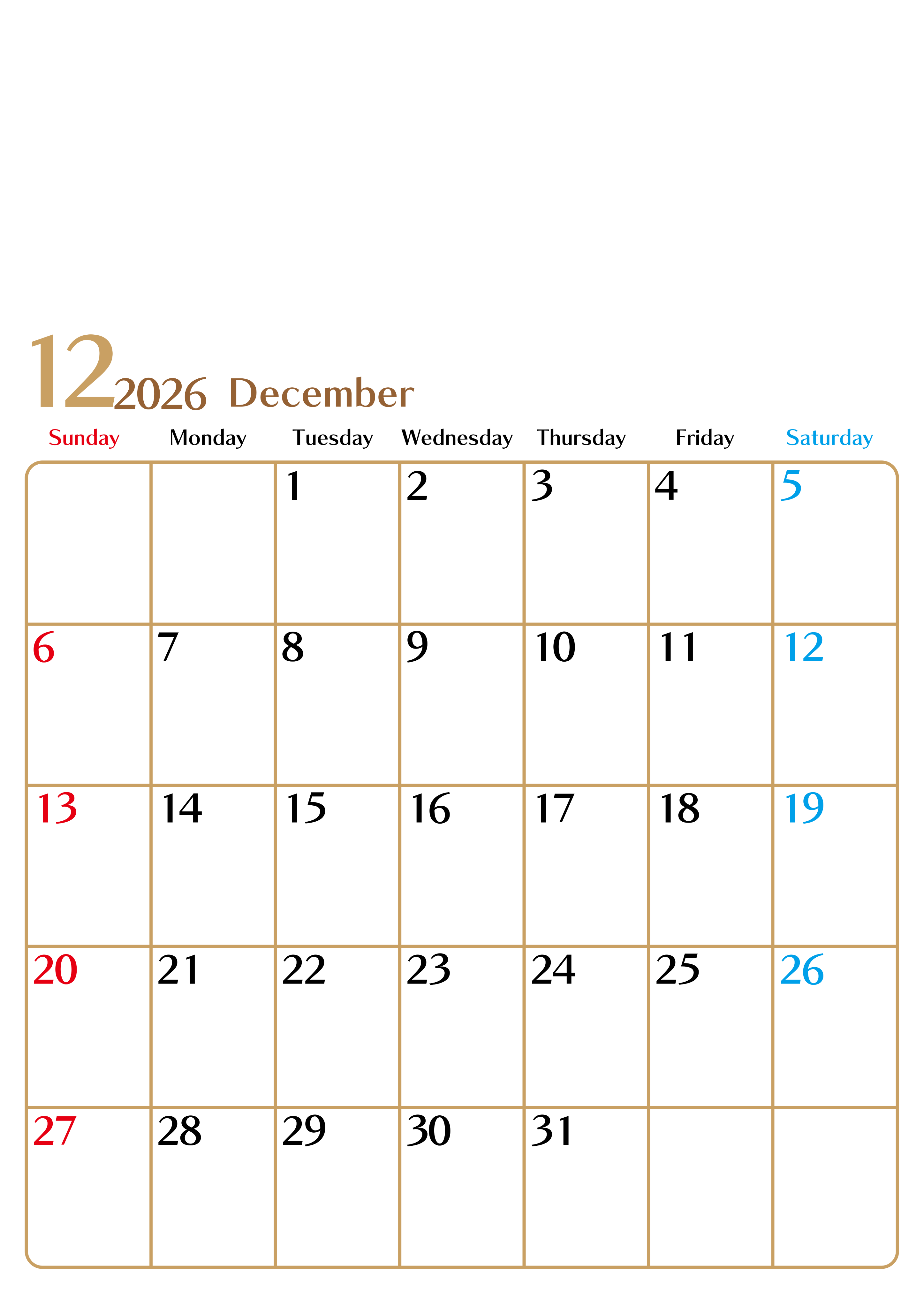 2026年・無料のカレンダーテンプレート 2026年12月縦型の日曜始まりカレンダー♪シンプルで書き込みしやすい文字が大きなA4用紙向け(無料)(2026-01171210) 素材状デザイン王 2025年4月8日 2026年12月縦型の日曜始まりの書き込みしやすい文字が大きなA4用紙向け(無料)です。予定を見える化するのに向いているのでダウンロードをおすすめ!プランの整理にぴったりです。(2026-01171210) シンプル 12月 縦型のカレンダー 日曜始まり カレンダーデザイン-0117