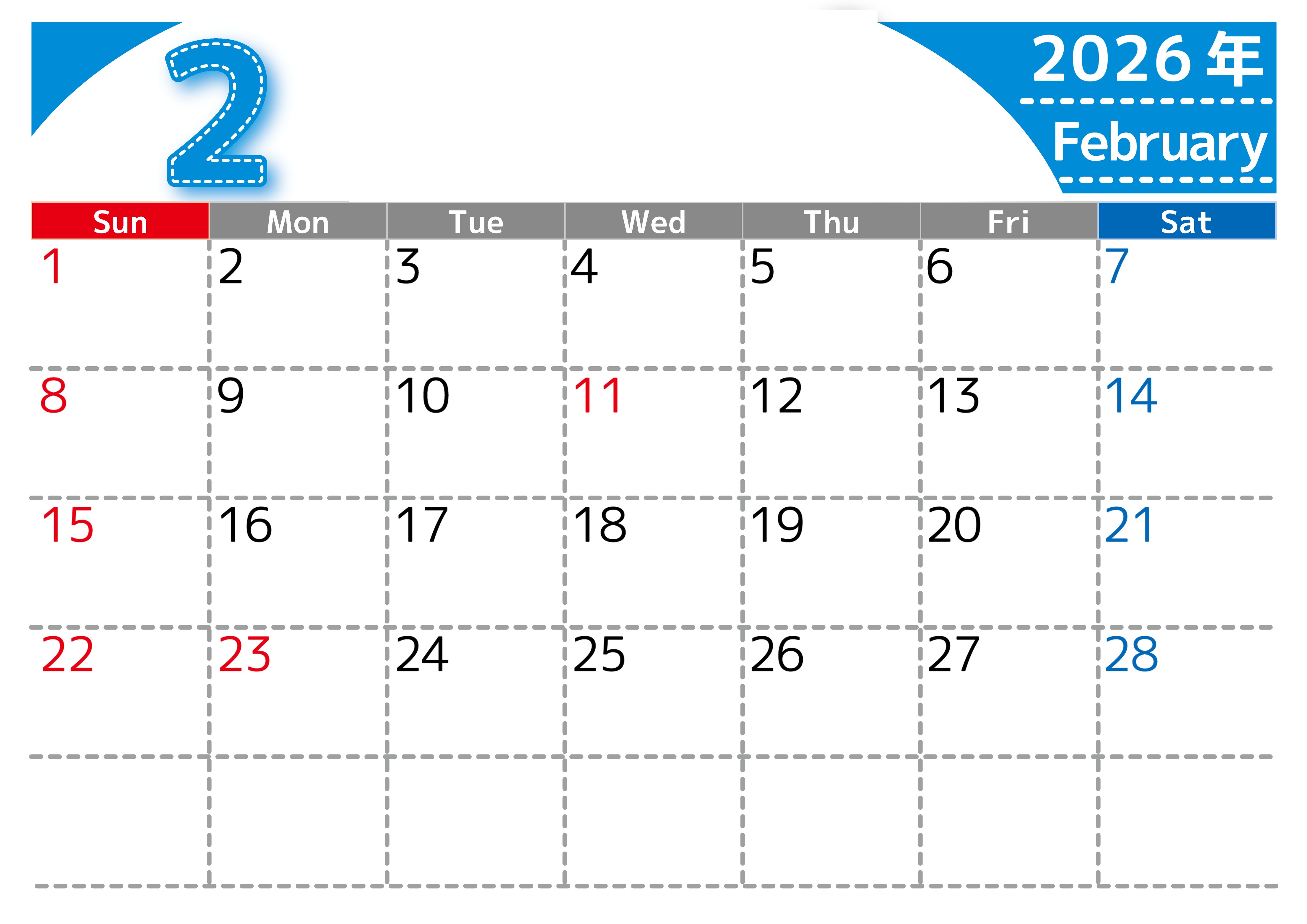 (無料カレンダー)2026年2月横型日曜始まりの大きい文字が見やすく書き込みも簡単なA4サイズ(シンプル)です。カレンダーに実用性を求める人にダウンロードを推奨します。忙しいスケジュールを簡単にまとめて書き込みましょう。(2026-01180200)