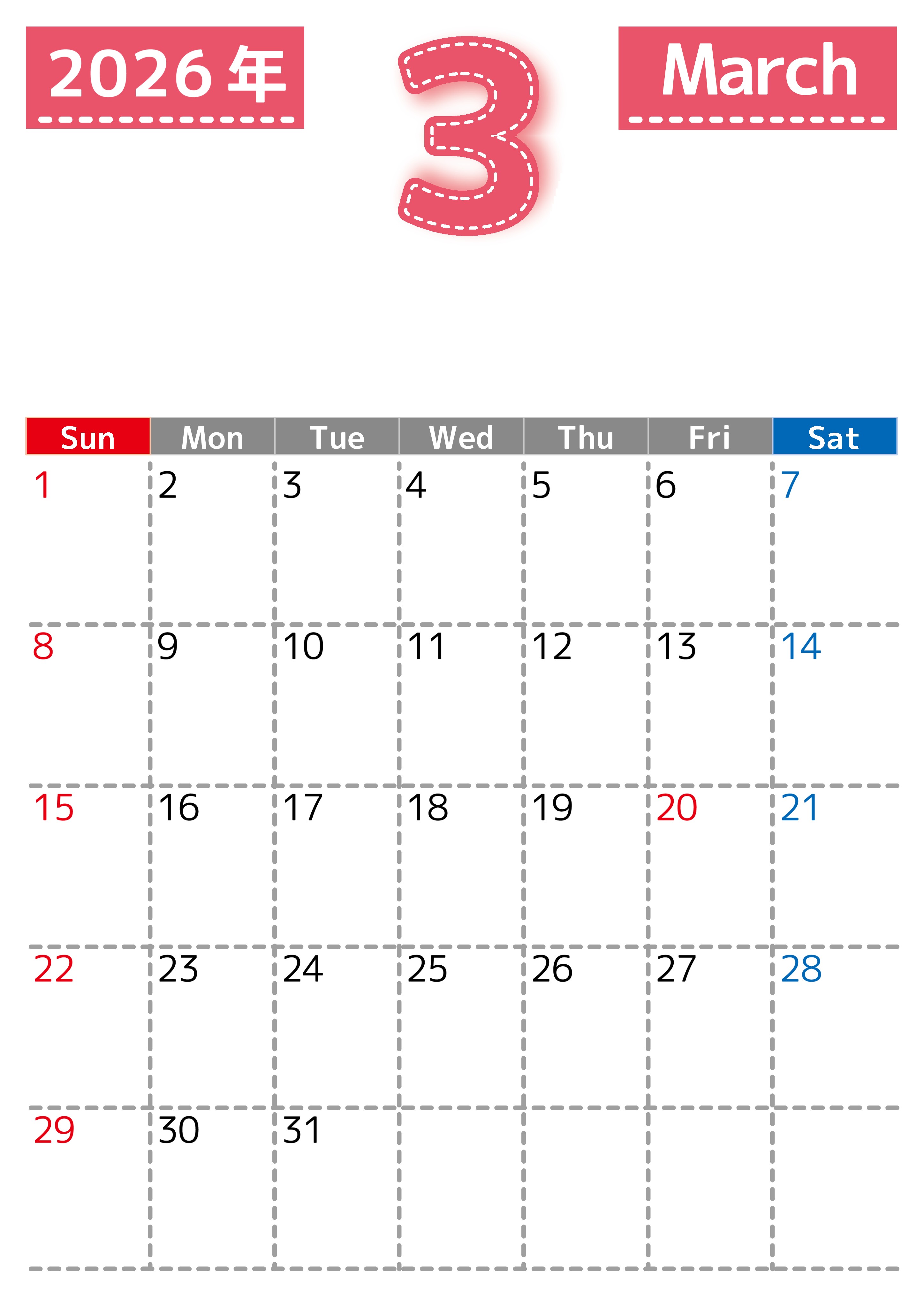 (無料カレンダー)2026年3月縦型日曜始まりの大きい文字が見やすく書き込みも簡単なA4サイズ(シンプル)です。カレンダーに実用性を求める人にダウンロードを推奨します。多忙なプランの可視化に役立ちます。(2026-01180310)