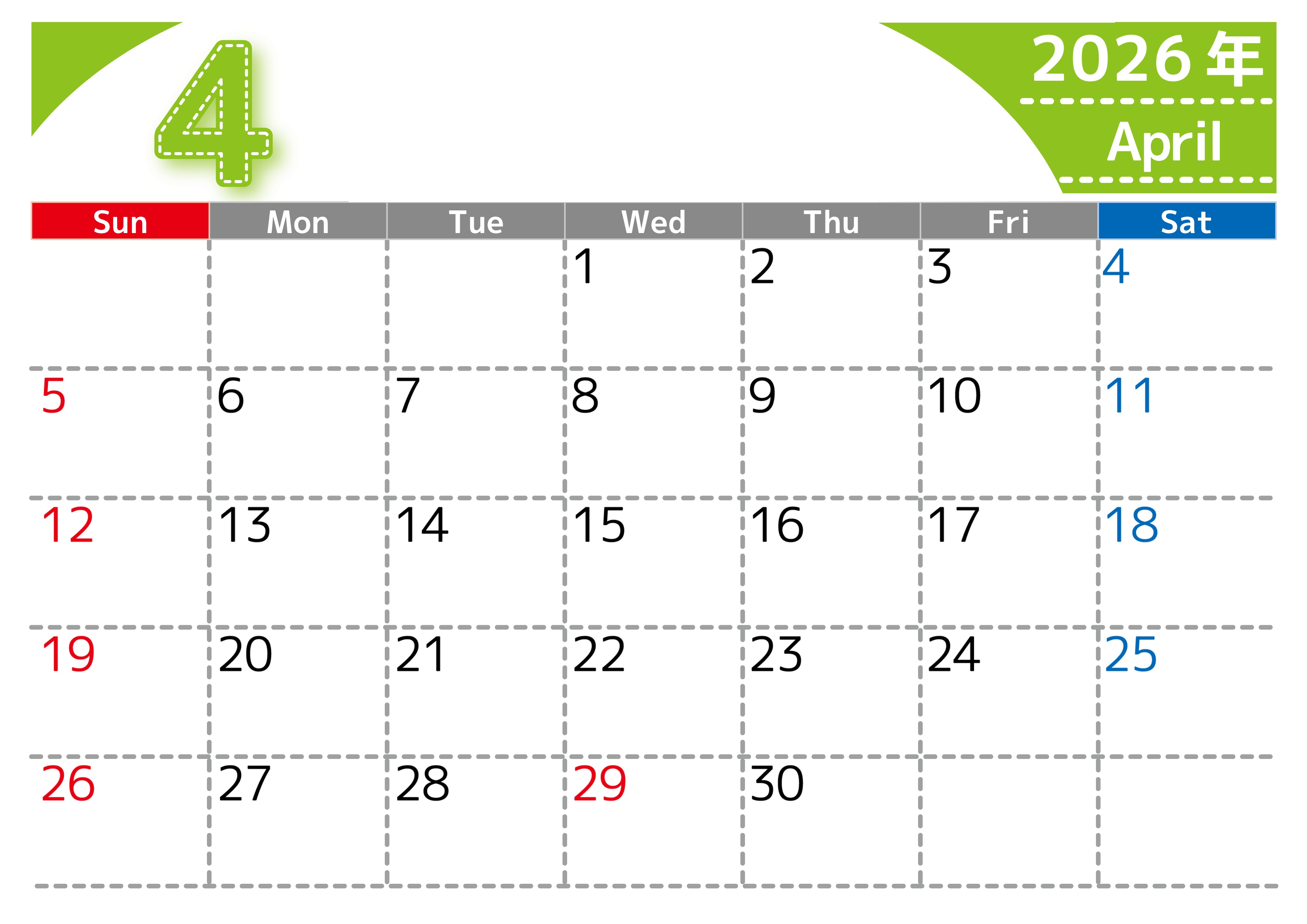 (無料カレンダー)2026年4月横型日曜始まりで大きい文字が見やすく書き込みも簡単なA4サイズ(シンプル)(2026-01180400)