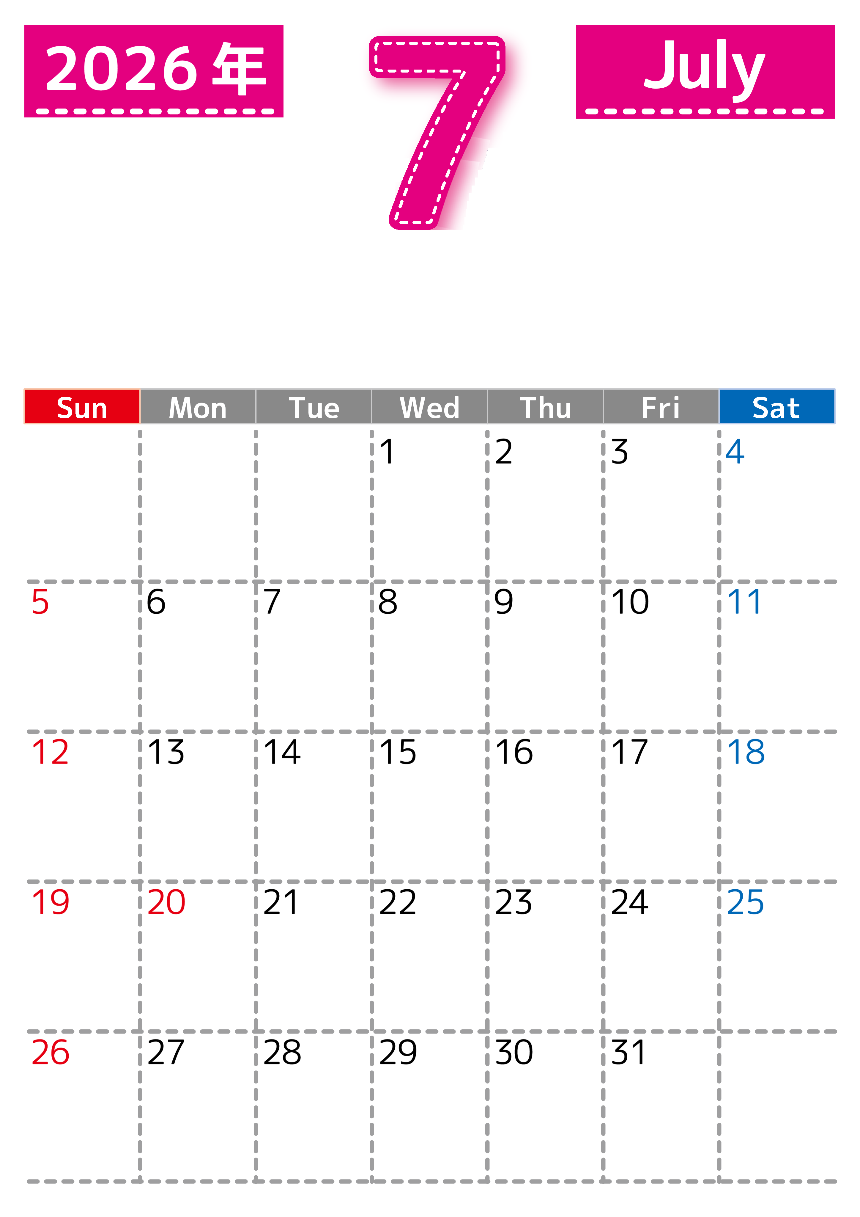 2026年・無料のカレンダーテンプレート (無料カレンダー)2026年7月縦型日曜始まりで 大きい文字が見やすく書き込みも簡単なA4サイズ(シンプル)(2026-01180710) 素材状デザイン王 2025年4月8日 (無料カレンダー)2026年7月縦型日曜始まりの大きい文字が見やすく書き込みも簡単なA4サイズ(シンプル)です。カレンダーに実用性を求める人にダウンロードを推奨します。計画を効率的に立てましょう。(2026-01180710) シンプル 7月 縦型のカレンダー 日曜始まり カレンダーデザイン-0118