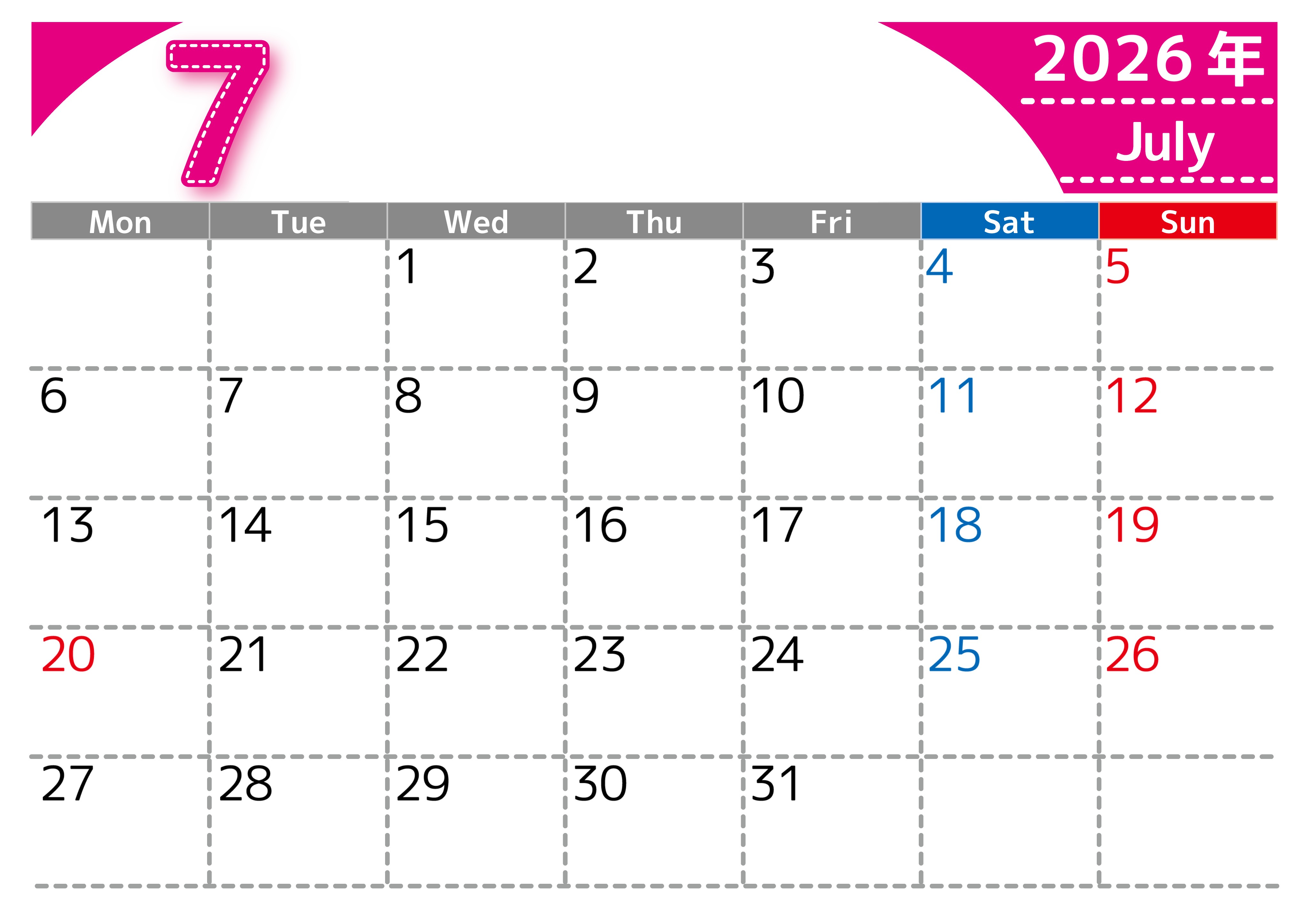 (無料カレンダー)2026年7月横型月曜始まりで 大きい文字が見やすく書き込みも簡単なA4サイズ(シンプル)(2026-01180701)