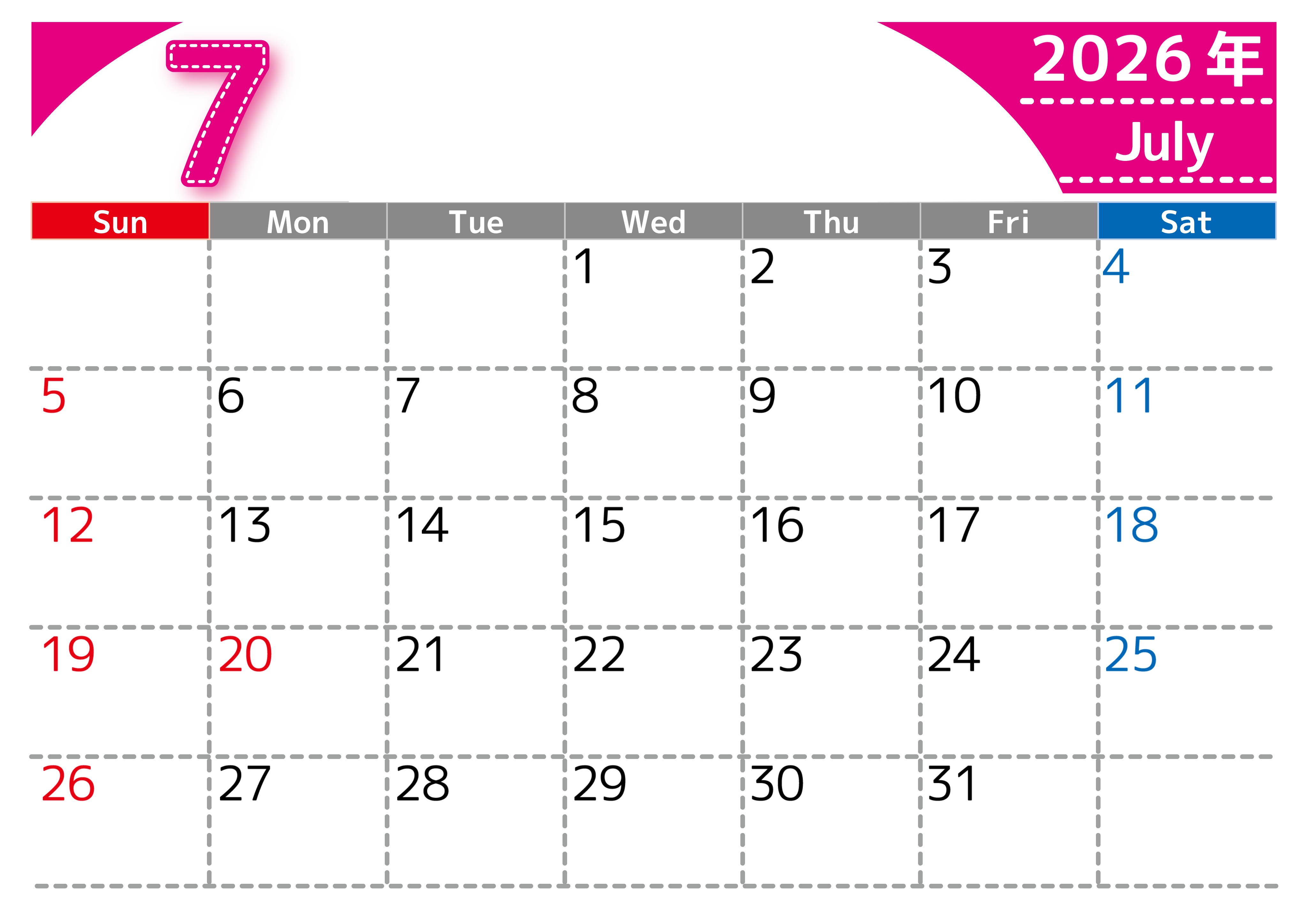 2026年・無料のカレンダーテンプレート (無料カレンダー)2026年7月横型日曜始まりで大きい文字が見やすく書き込みも簡単なA4サイズ(シンプル)(2026-01180700) 素材状デザイン王 2025年4月8日 (無料カレンダー)2026年7月横型日曜始まりの大きい文字が見やすく書き込みも簡単なA4サイズ(シンプル)です。カレンダーに実用性を求める人にダウンロードを推奨します。計画を効率的に立てましょう。(2026-01180700) シンプル 7月 横型のカレンダー 日曜始まり カレンダーデザイン-0118