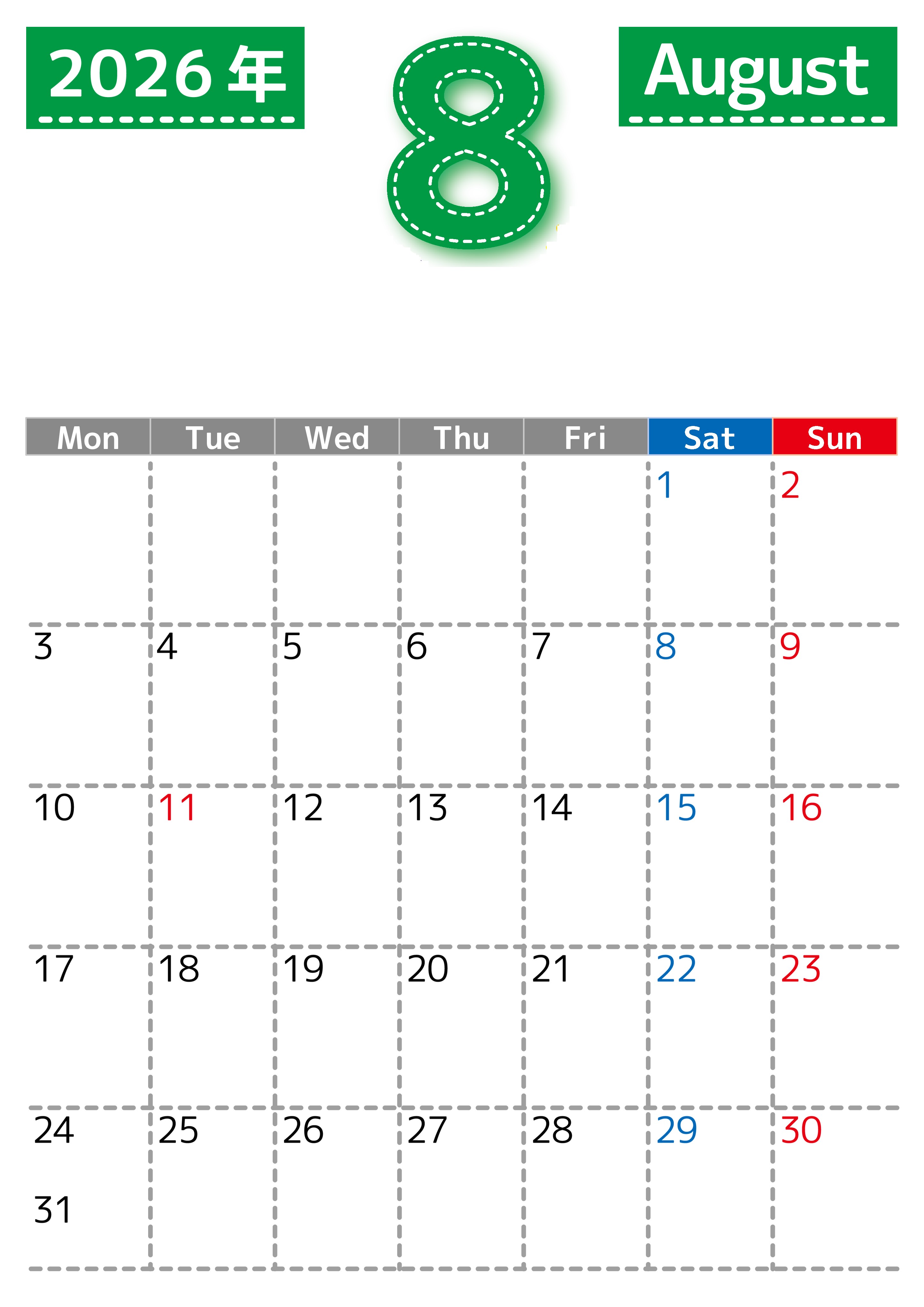 (無料カレンダー)2026年8月縦型月曜始まりで大きい文字が見やすく書き込みも簡単なA4サイズ(シンプル)(2026-01180811)