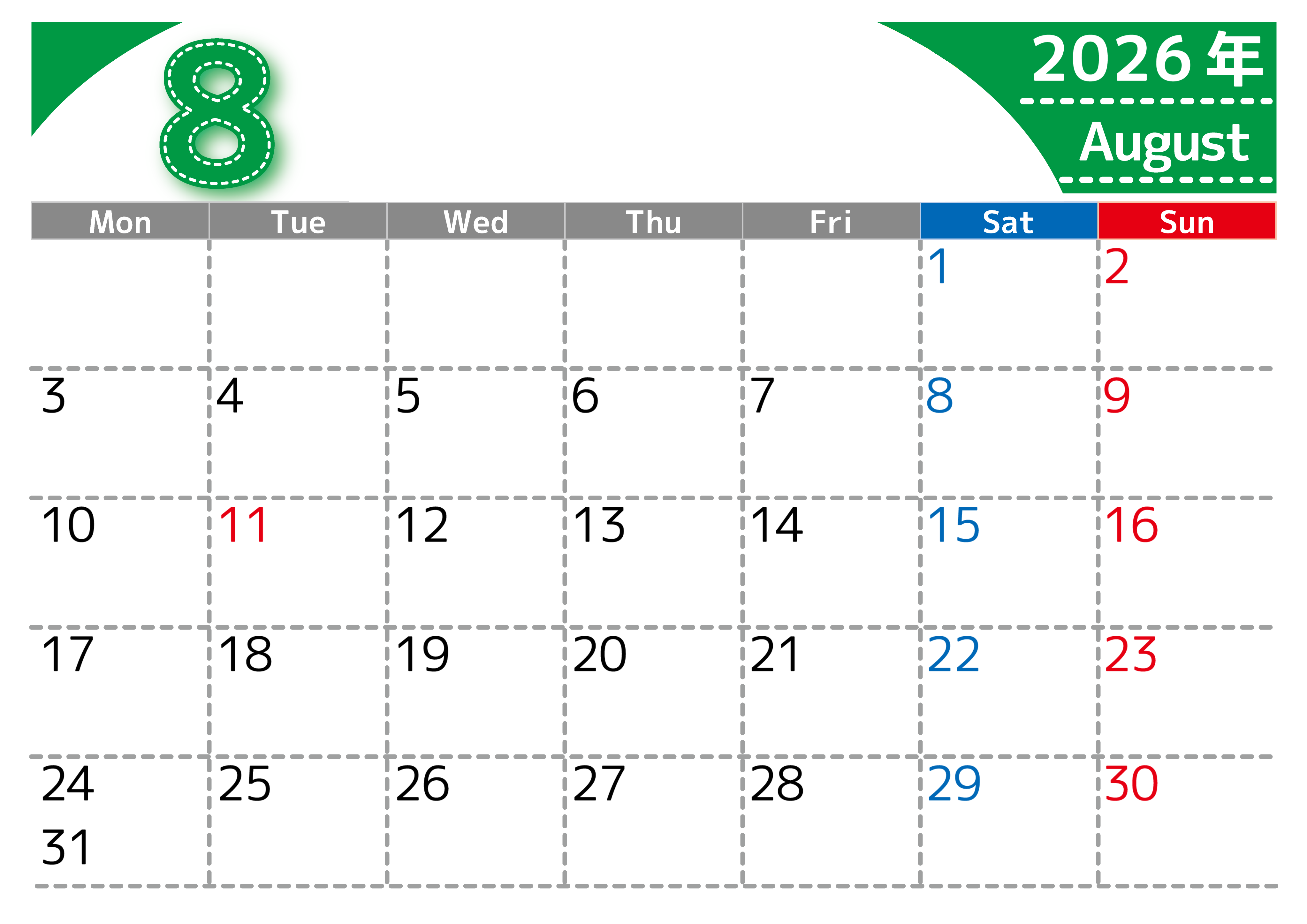 (無料カレンダー)2026年8月横型月曜始まりの大きい文字が見やすく書き込みも簡単なA4サイズ(シンプル)です。カレンダーに実用性を求める人にダウンロードを推奨します。忙しいスケジュールを簡単にまとめて書き込みましょう。(2026-01180801)
