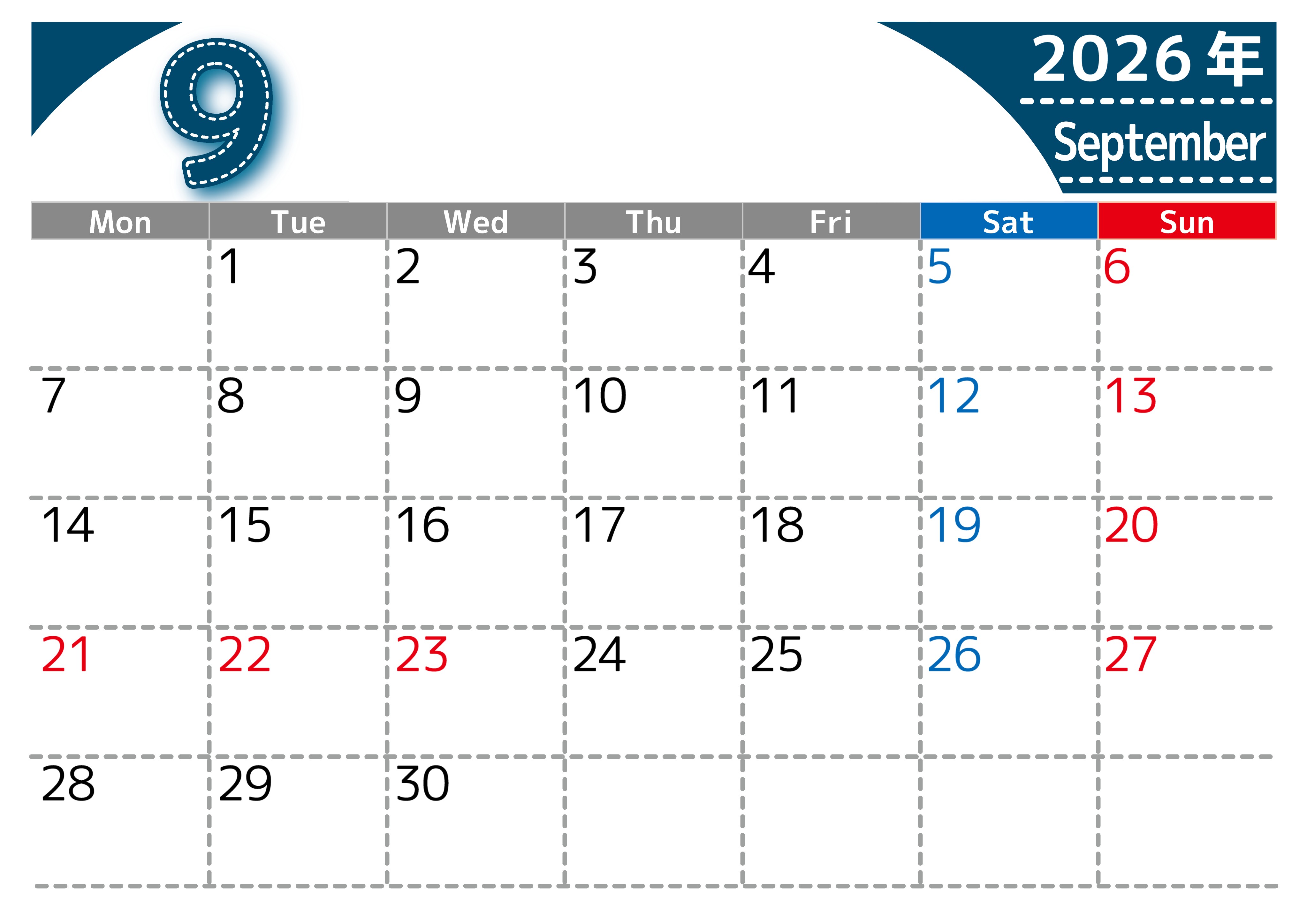 (無料カレンダー)2026年9月横型月曜始まりの大きい文字が見やすく書き込みも簡単なA4サイズ(シンプル)です。カレンダーに実用性を求める人にダウンロードを推奨します。多忙なプランの可視化に役立ちます。(2026-01180901)