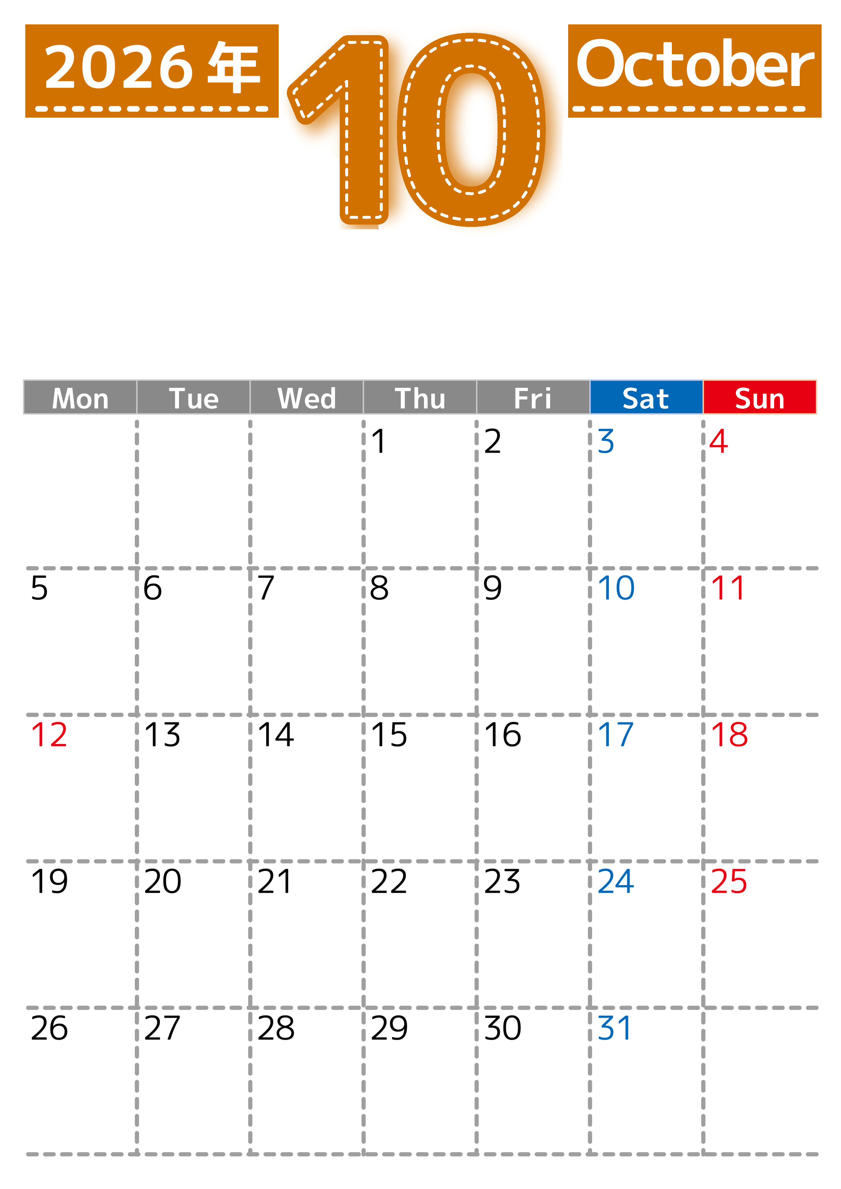 (無料カレンダー)2026年10月縦型月曜始まりの大きい文字が見やすく書き込みも簡単なA4サイズ(シンプル)です。カレンダーに実用性を求める人にダウンロードを推奨します。計画を効率的に立てましょう。(2026-01181011)