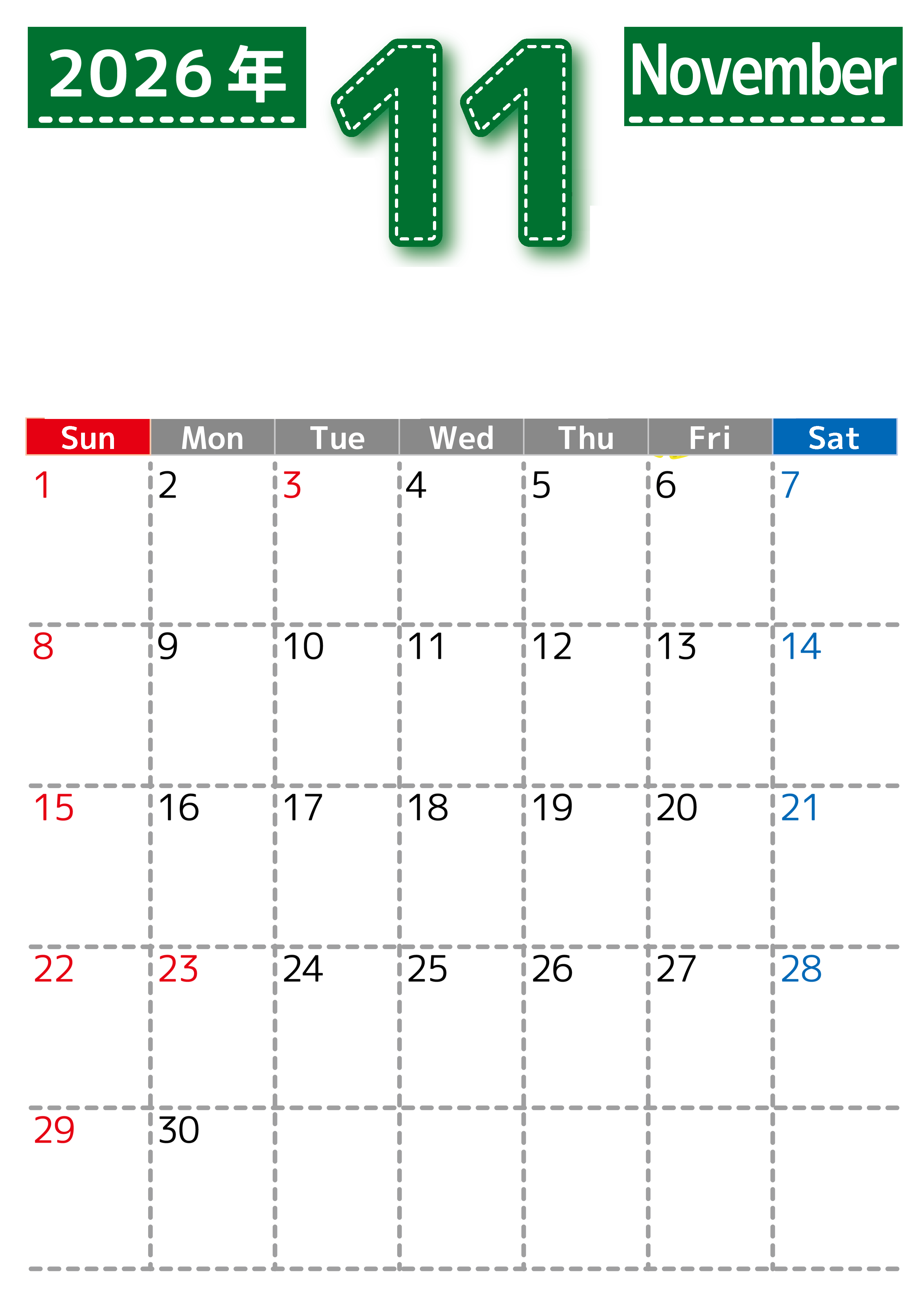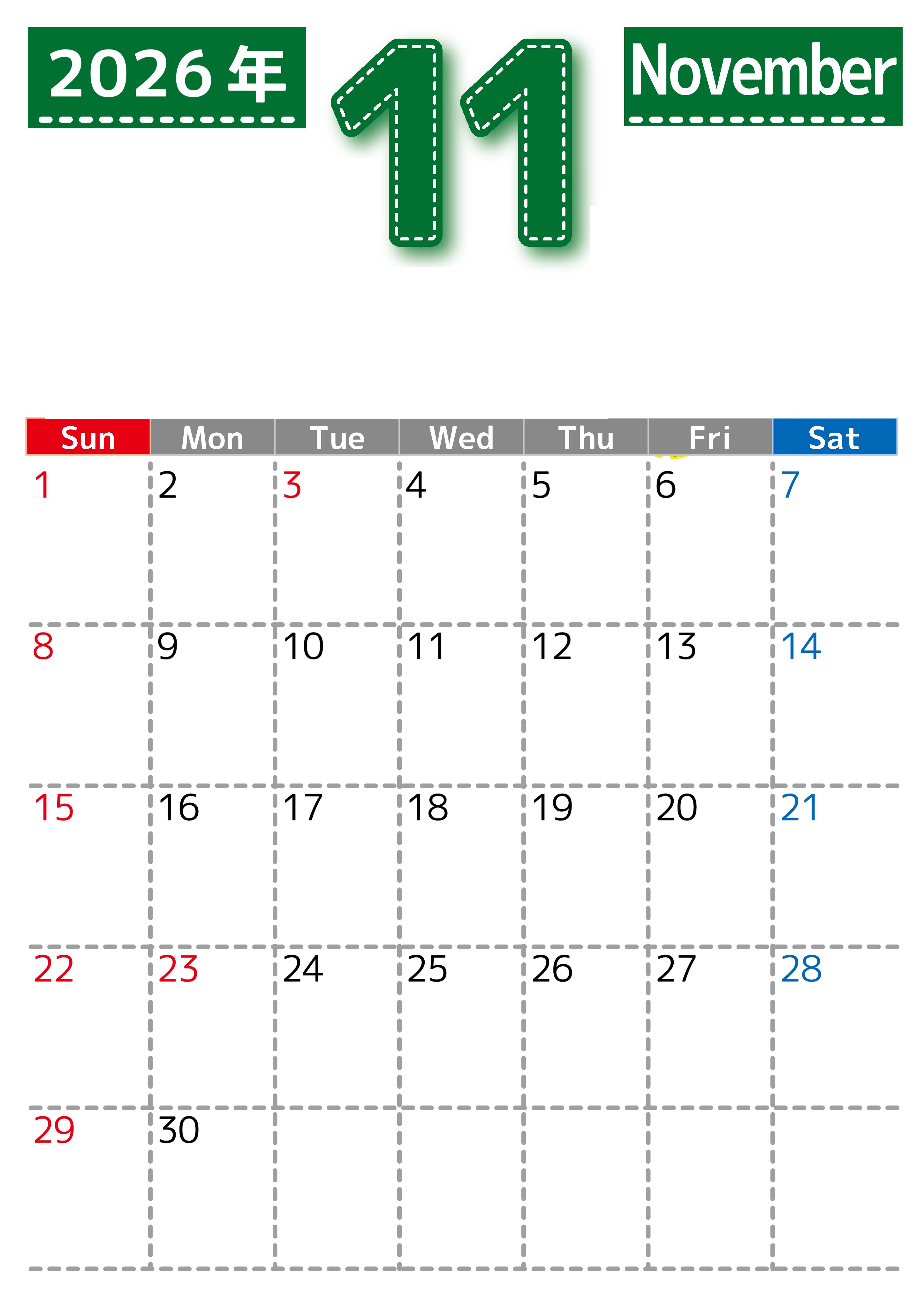 (無料カレンダー)2026年11月縦型日曜始まりの大きい文字が見やすく書き込みも簡単なA4サイズ(シンプル)です。カレンダーに実用性を求める人にダウンロードを推奨します。忙しいスケジュールを簡単にまとめて書き込みましょう。(2026-01181110)