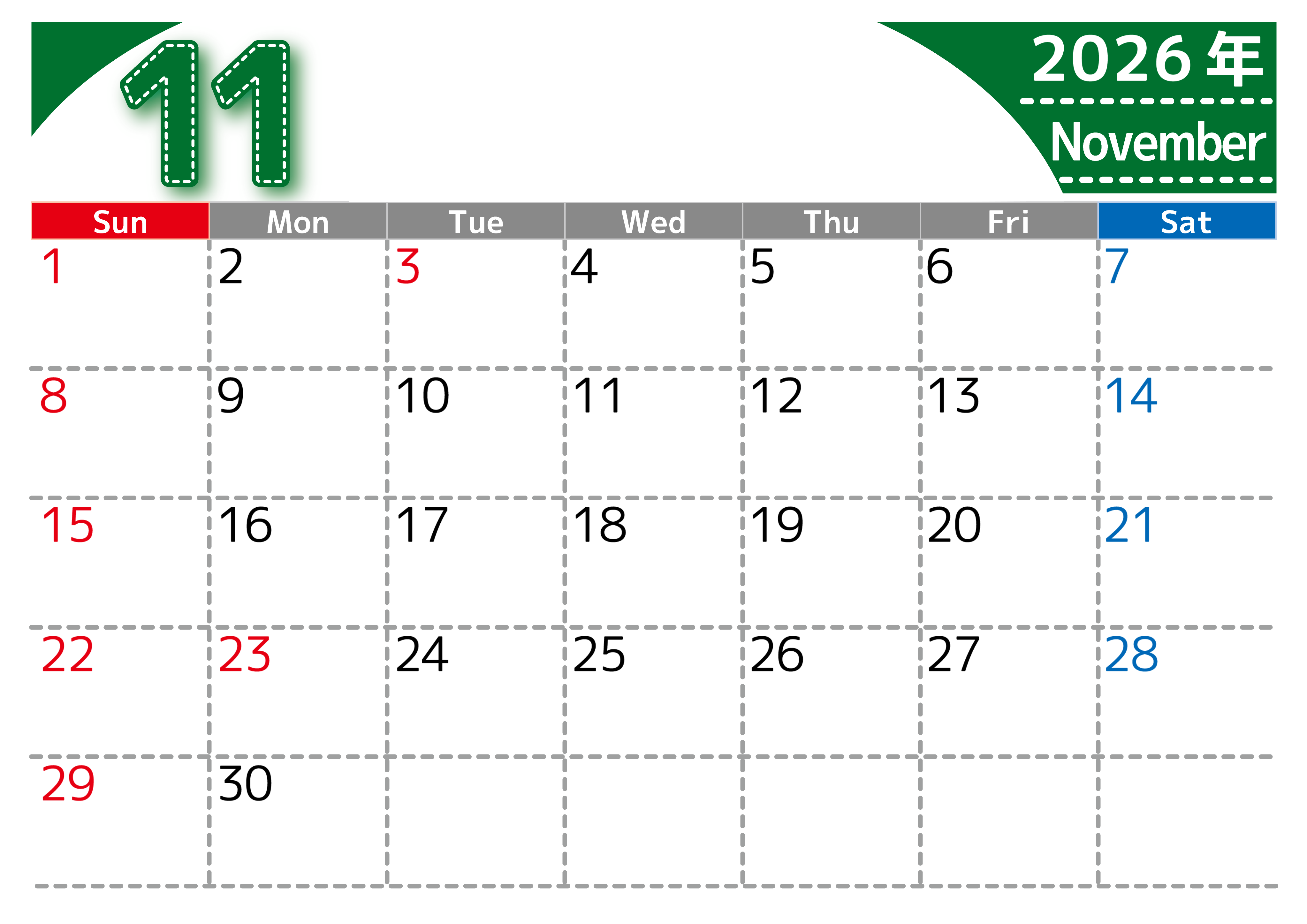 (無料カレンダー)2026年11月横型日曜始まりの大きい文字が見やすく書き込みも簡単なA4サイズ(シンプル)です。カレンダーに実用性を求める人にダウンロードを推奨します。忙しいスケジュールを簡単にまとめて書き込みましょう。(2026-01181100)