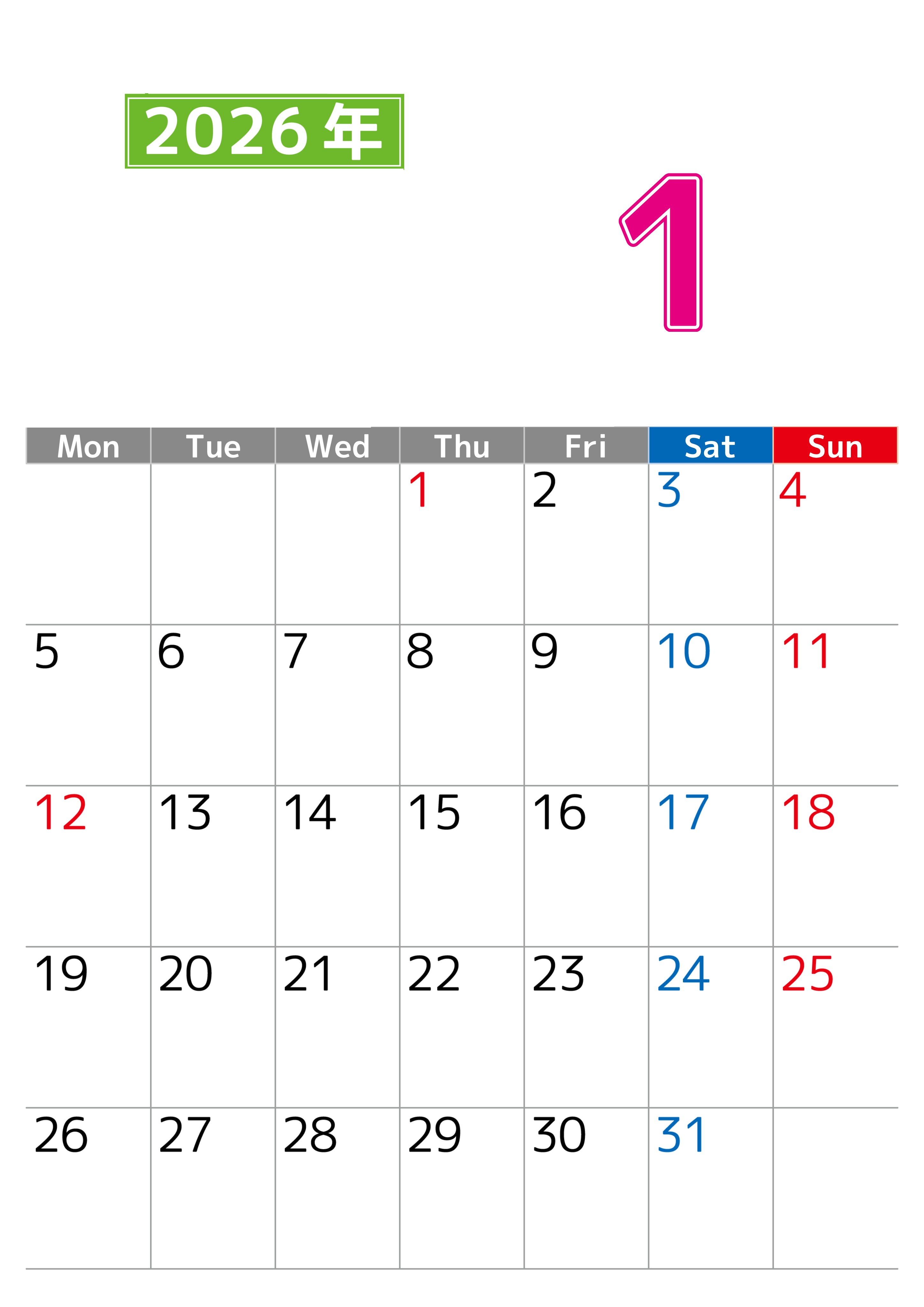 シンプルな2026年1月縦型月曜始まりのカレンダー!書き込み欄が大きい便利な無料素材(2026-01190111)