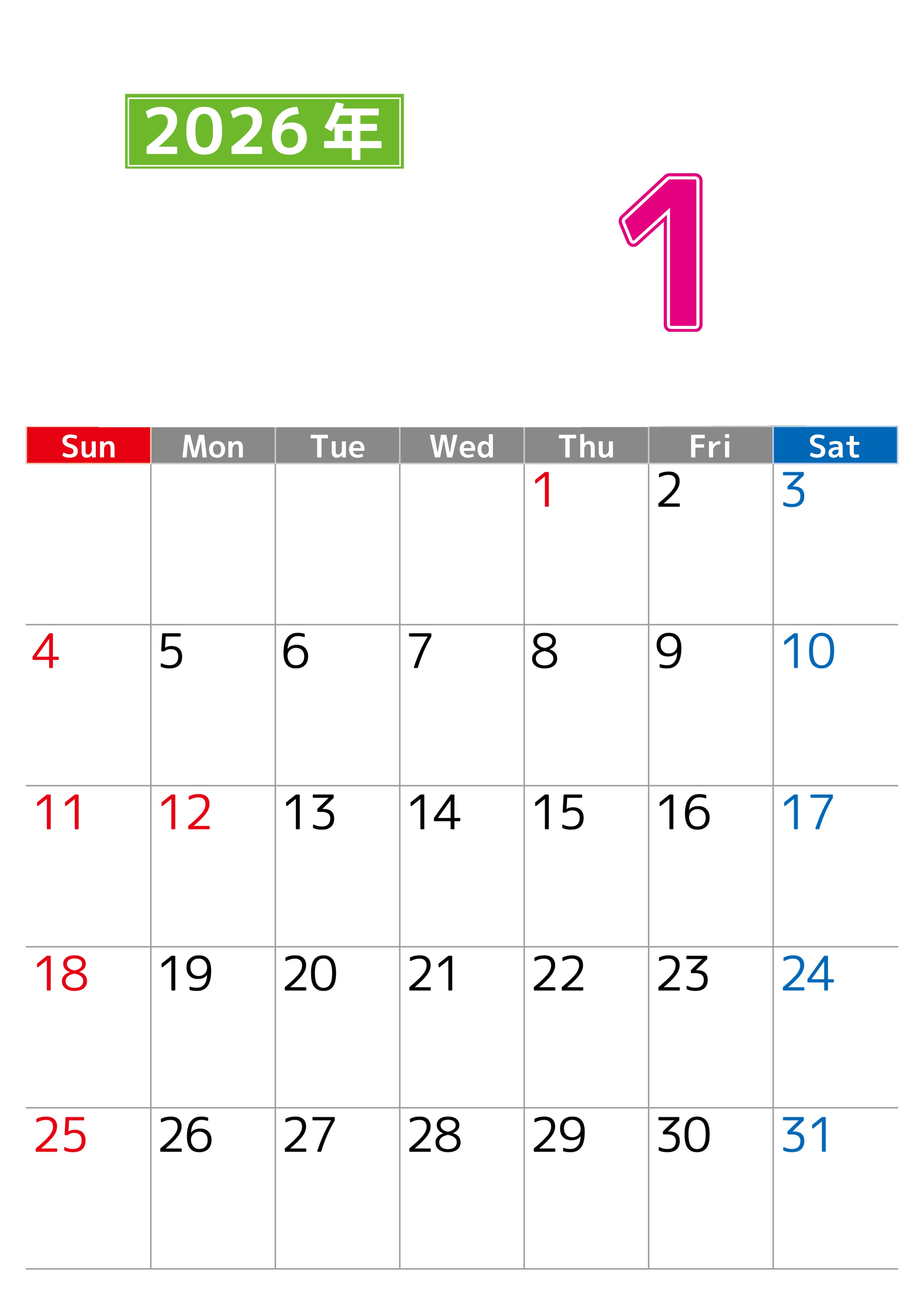 シンプルな2026年1月縦型日曜始まりのカレンダー!書き込み欄が大きい便利な無料素材(2026-01190110)