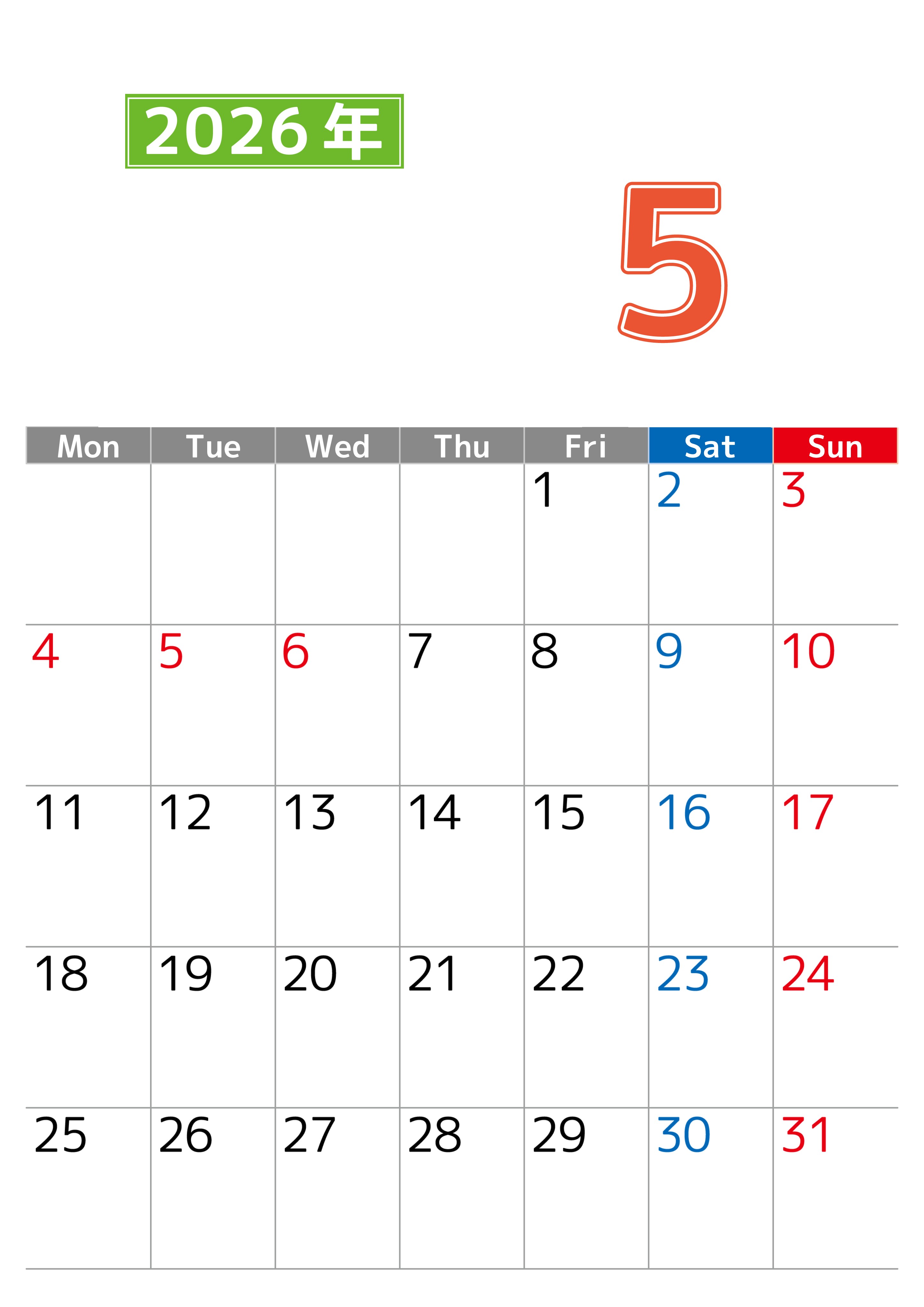 2026年・無料のカレンダーテンプレート シンプルな2026年5月縦型月曜始まりのカレンダー!書き込み欄が大きい便利な無料素材(2026-01190511) 素材状デザイン王 2025年4月8日 シンプルな2026年5月縦型月曜始まりの書き込み欄が大きい便利な無料素材です。余白が広いので沢山書き込めます。スケジュールを管理しやすいです。(2026-01190511) シンプル 5月 縦型のカレンダー 月曜始まり カレンダーデザイン-0119