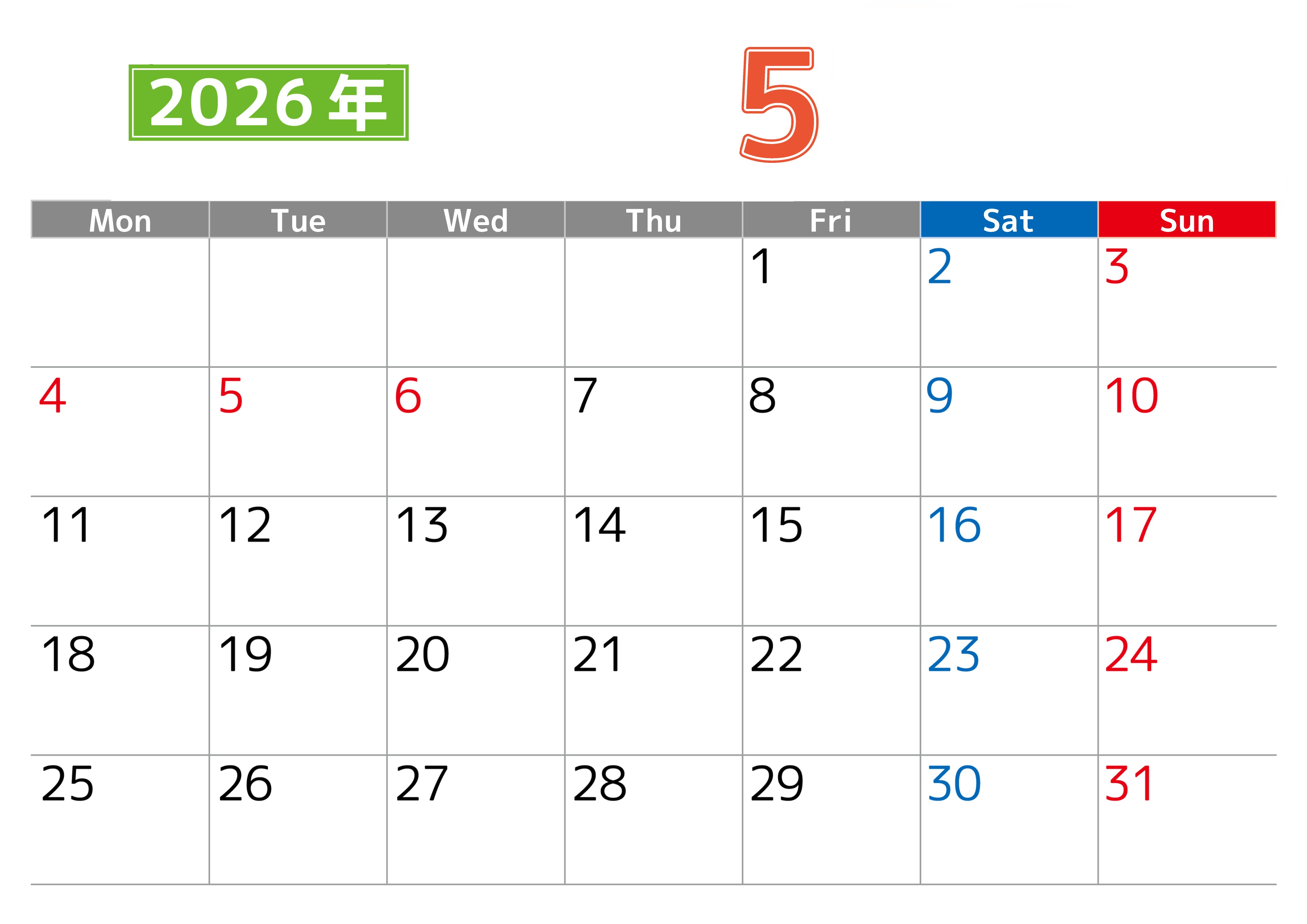 2026年・無料のカレンダーテンプレート シンプルな2026年5月横型月曜始まりのカレンダー!書き込み欄が大きい便利な無料素材(2026-01190501) 素材状デザイン王 2025年4月8日 シンプルな2026年5月横型月曜始まりの書き込み欄が大きい便利な無料素材です。余白が広いので沢山書き込めます。スケジュールを管理しやすいです。(2026-01190501) シンプル 5月 横型のカレンダー 月曜始まり カレンダーデザイン-0119