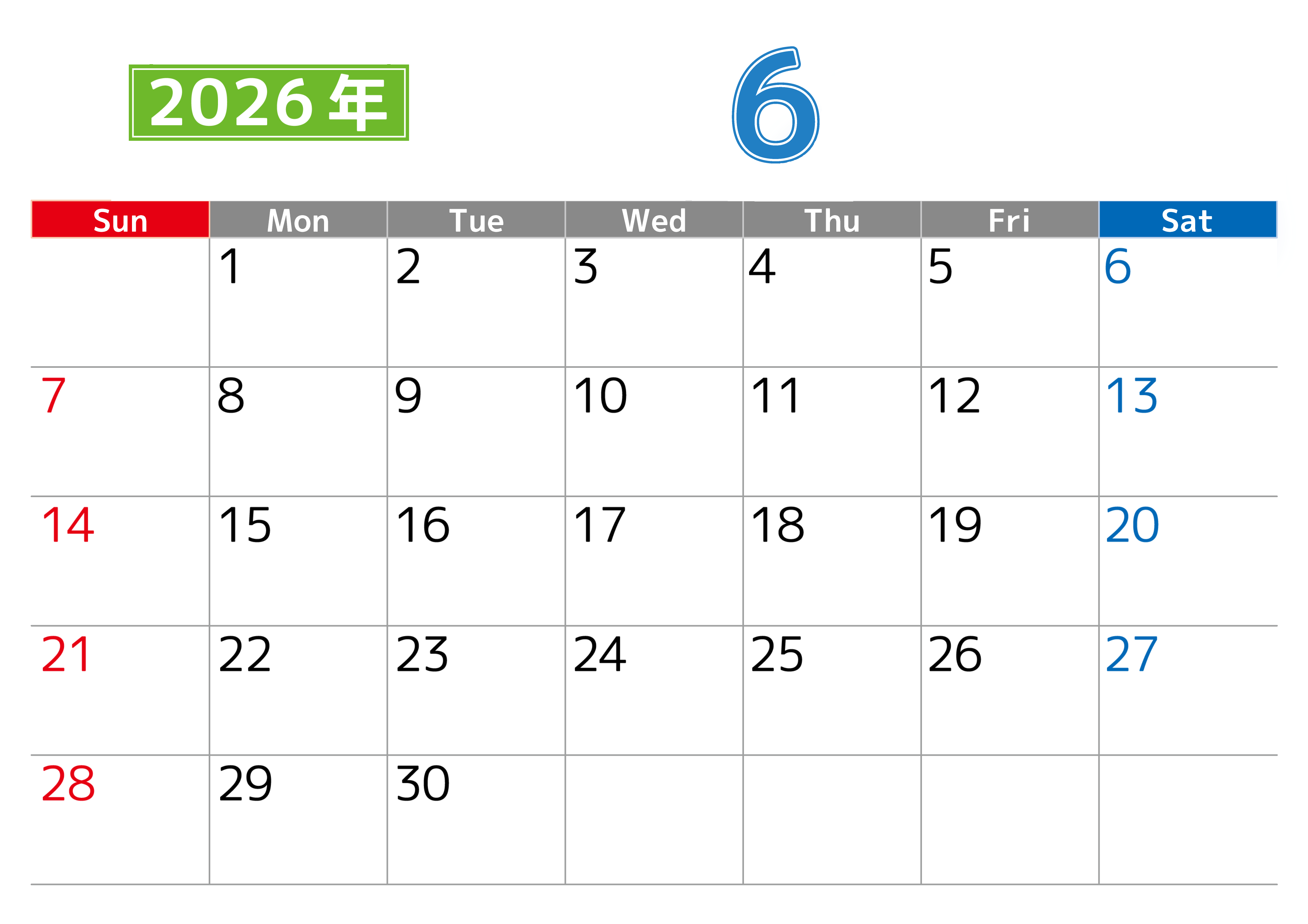 2026年・無料のカレンダーテンプレート シンプルな2026年6月横型日曜始まりのカレンダー!書き込み欄が大きい便利な無料素材(2026-01190600) 素材状デザイン王 2025年4月8日 シンプルな2026年6月横型日曜始まりの書き込み欄が大きい便利な無料素材です。余白が広いので沢山書き込めます。プランの整理にぴったりです。(2026-01190600) シンプル 6月 横型のカレンダー 日曜始まり カレンダーデザイン-0119