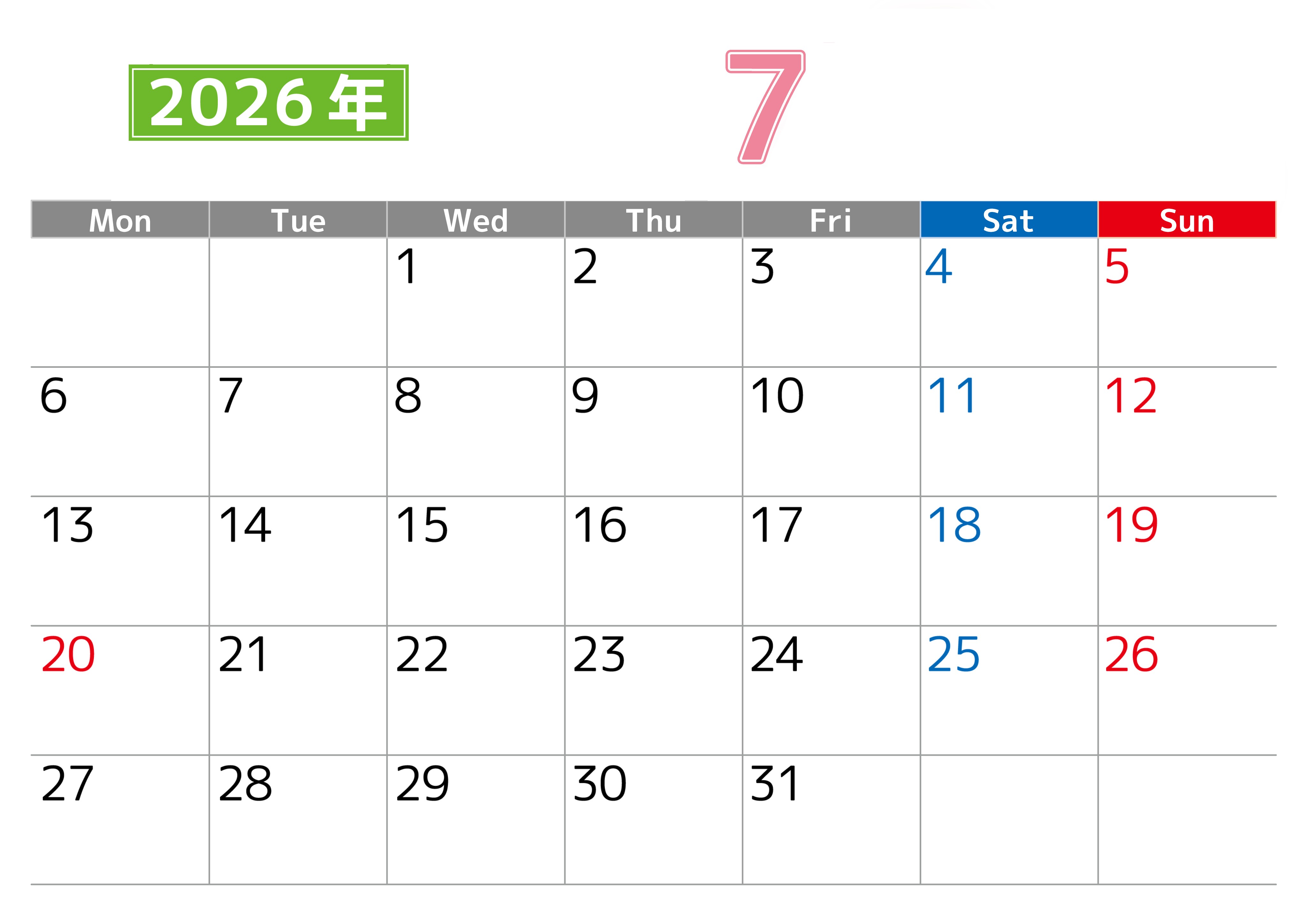 2026年・無料のカレンダーテンプレート シンプルな2026年7月横型月曜始まりのカレンダー! 書き込み欄が大きい便利な無料素材(2026-01190701) 素材状デザイン王 2025年4月8日 シンプルな2026年7月横型月曜始まりの書き込み欄が大きい便利な無料素材です。余白が広いので沢山書き込めます。計画を立てるのに最適です。(2026-01190701) シンプル 7月 横型のカレンダー 月曜始まり カレンダーデザイン-0119