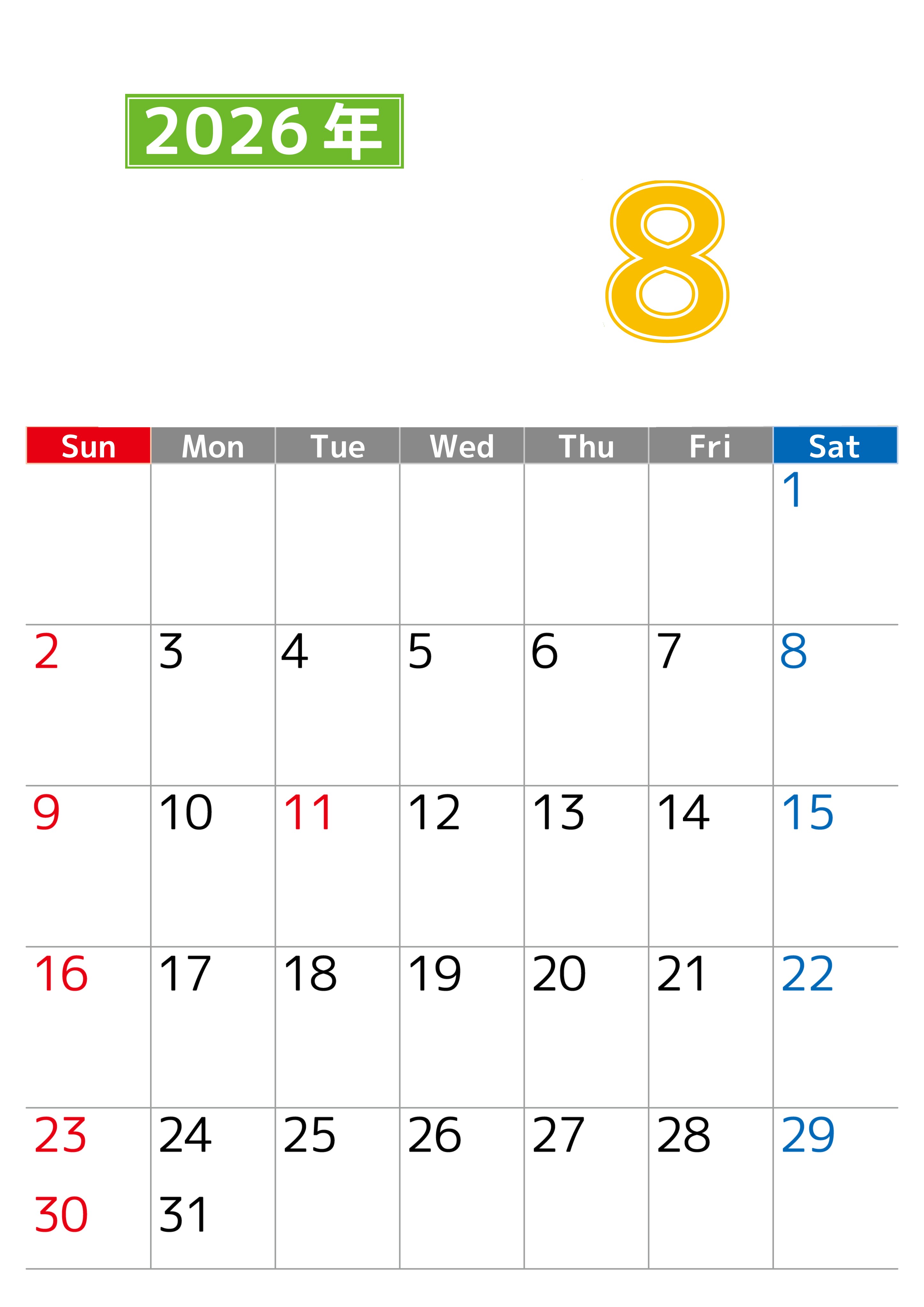 2026年・無料のカレンダーテンプレート シンプルな2026年8月縦型日曜始まりのカレンダー!書き込み欄が大きい便利な無料素材(2026-01190810) 素材状デザイン王 2025年4月8日 シンプルな2026年8月縦型日曜始まりの書き込み欄が大きい便利な無料素材です。余白が広いので沢山書き込めます。スケジュールを管理しやすいです。(2026-01190810) シンプル 8月 縦型のカレンダー 日曜始まり カレンダーデザイン-0119