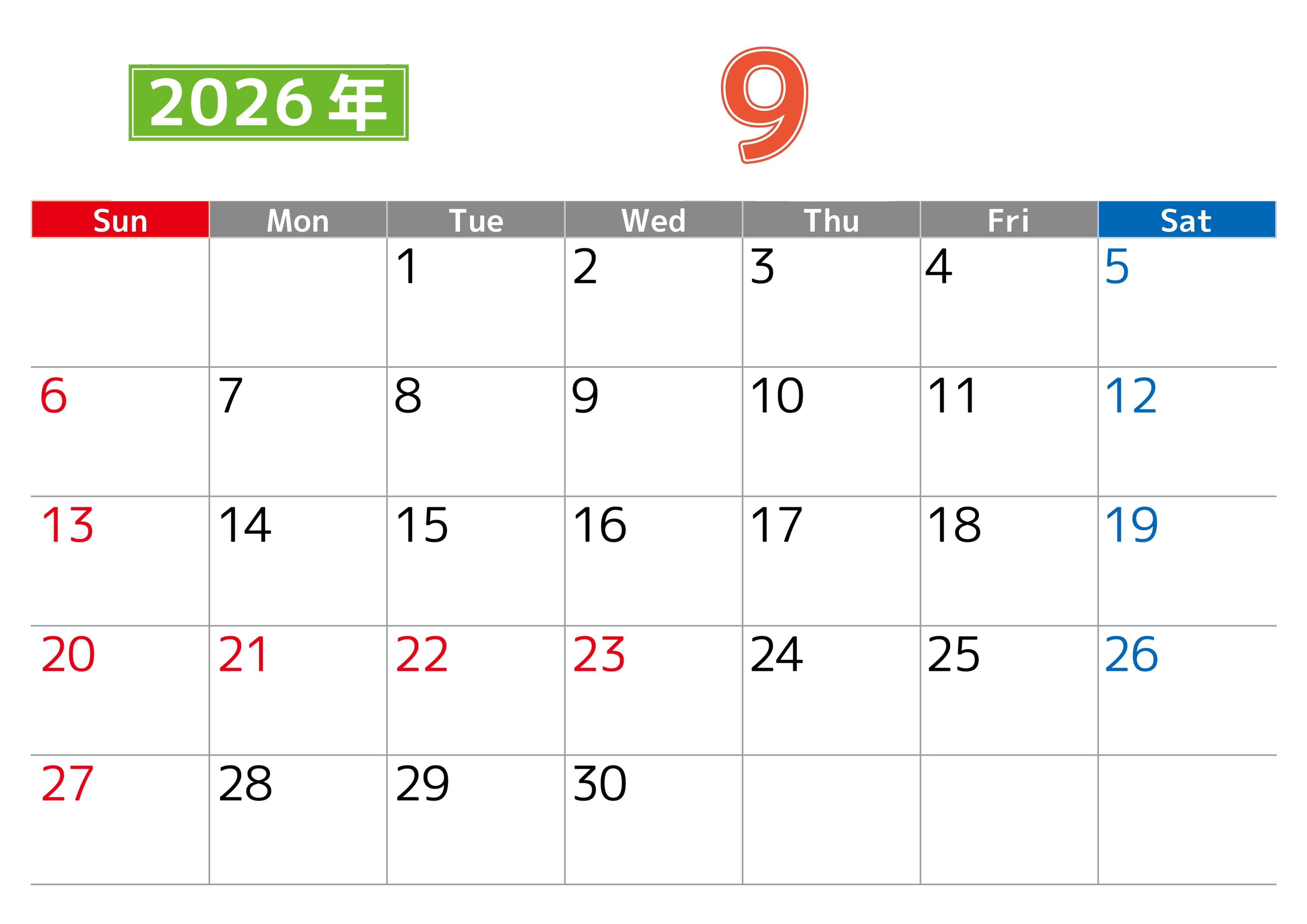 2026年・無料のカレンダーテンプレート シンプルな2026年9月横型日曜始まりのカレンダー!書き込み欄が大きい便利な無料素材(2026-01190900) 素材状デザイン王 2025年4月8日 シンプルな2026年9月横型日曜始まりの書き込み欄が大きい便利な無料素材です。余白が広いので沢山書き込めます。プランの整理にぴったりです。(2026-01190900) シンプル 9月 横型のカレンダー 日曜始まり カレンダーデザイン-0119