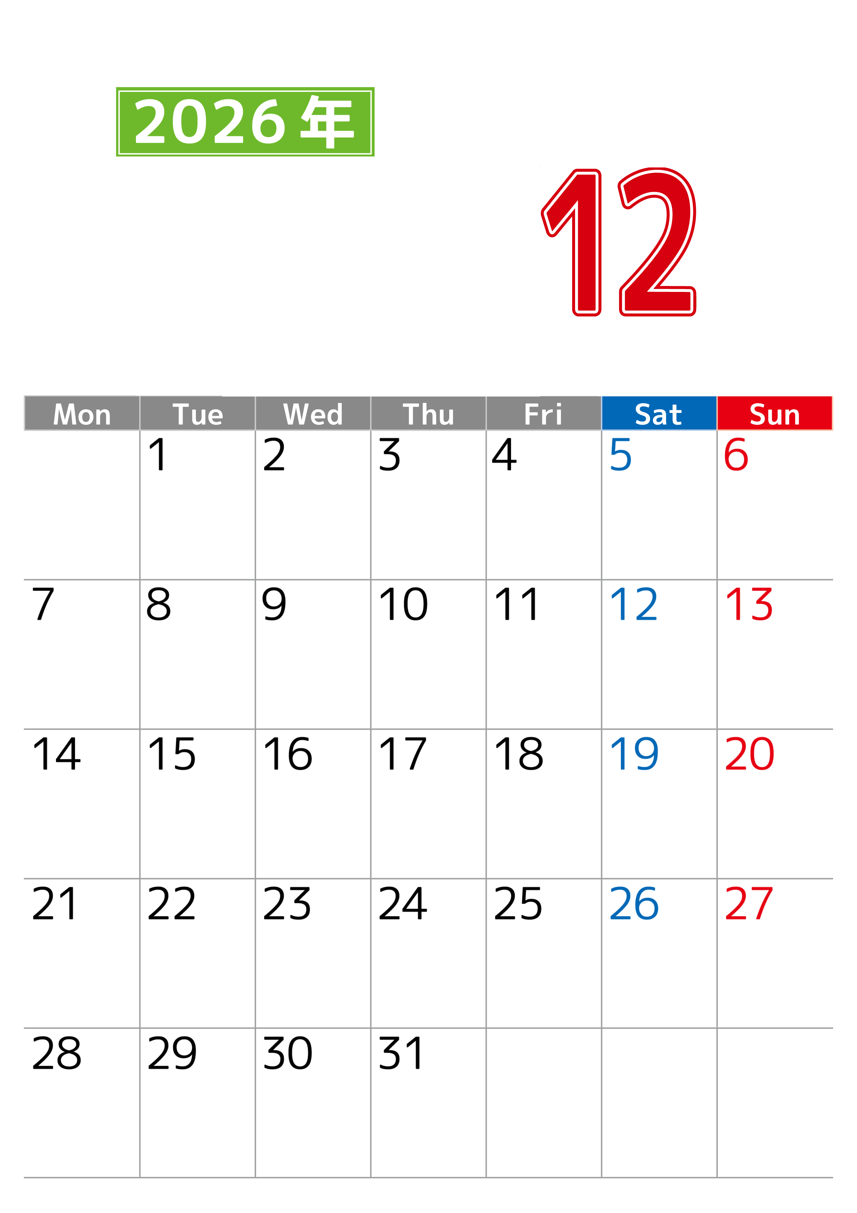 2026年・無料のカレンダーテンプレート シンプルな2026年12月縦型月曜始まりのカレンダー!書き込み欄が大きい便利な無料素材(2026-01191211) 素材状デザイン王 2025年4月8日 シンプルな2026年12月縦型月曜始まりの書き込み欄が大きい便利な無料素材です。余白が広いので沢山書き込めます。プランの整理にぴったりです。(2026-01191211) シンプル 12月 縦型のカレンダー 月曜始まり カレンダーデザイン-0119