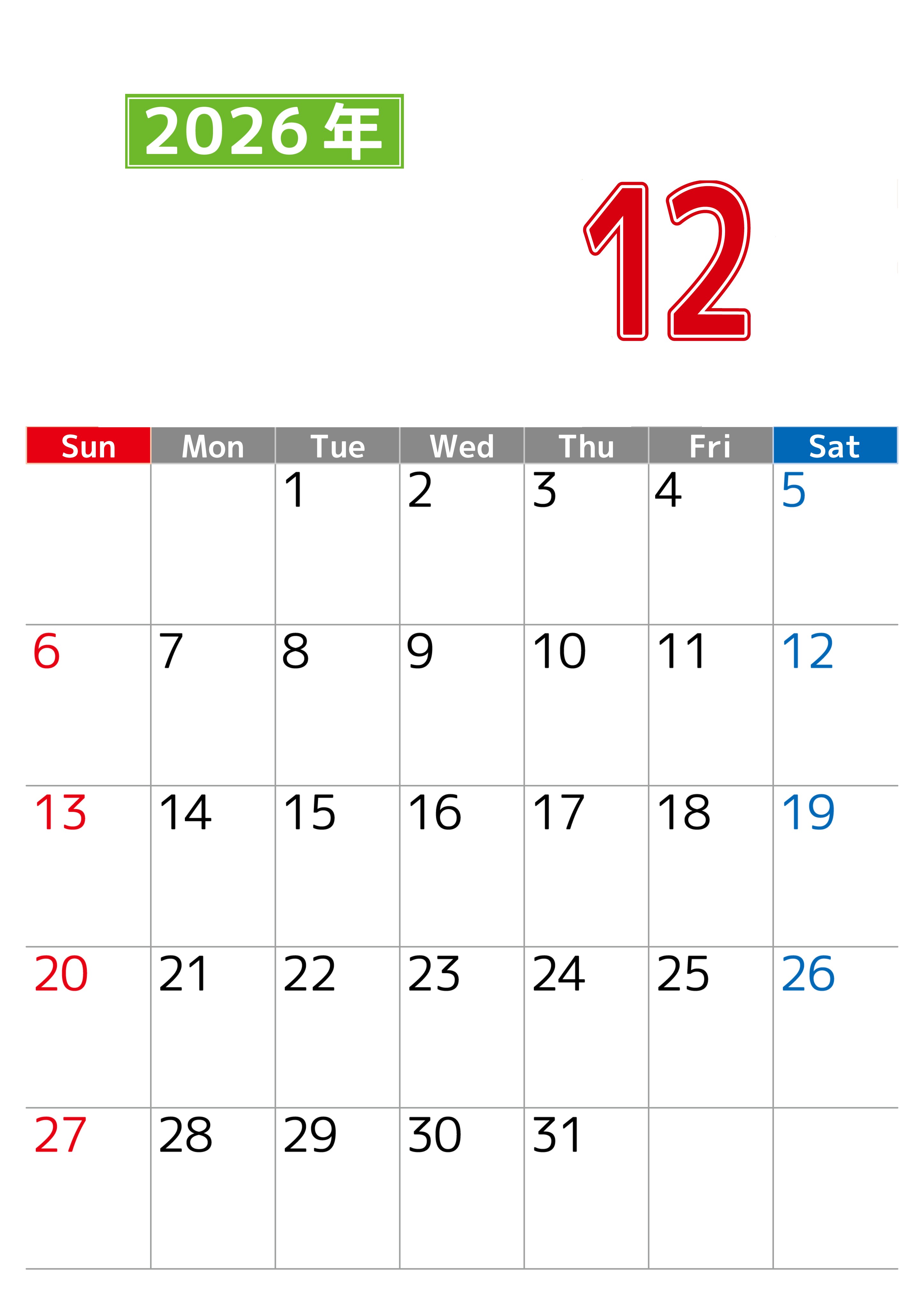 2026年・無料のカレンダーテンプレート シンプルな2026年12月縦型日曜始まりのカレンダー!書き込み欄が大きい便利な無料素材(2026-01191210) 素材状デザイン王 2025年4月8日 シンプルな2026年12月縦型日曜始まりの書き込み欄が大きい便利な無料素材です。余白が広いので沢山書き込めます。プランの整理にぴったりです。(2026-01191210) シンプル 12月 縦型のカレンダー 日曜始まり カレンダーデザイン-0119