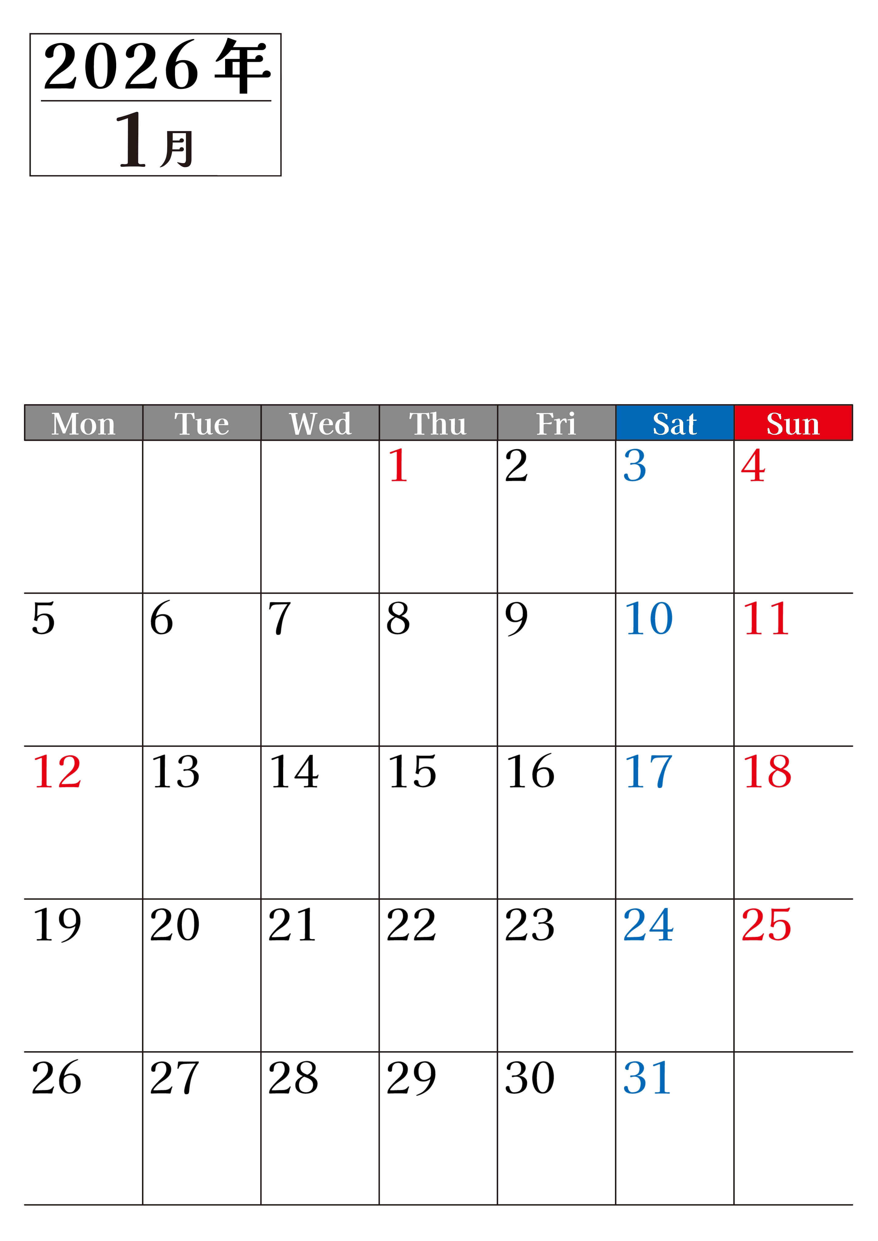 2026年のカレンダー1月縦型月曜始まり!シンプルで書き込み欄が大きい見やすい!ダウンロードは無料(2026-01200111)