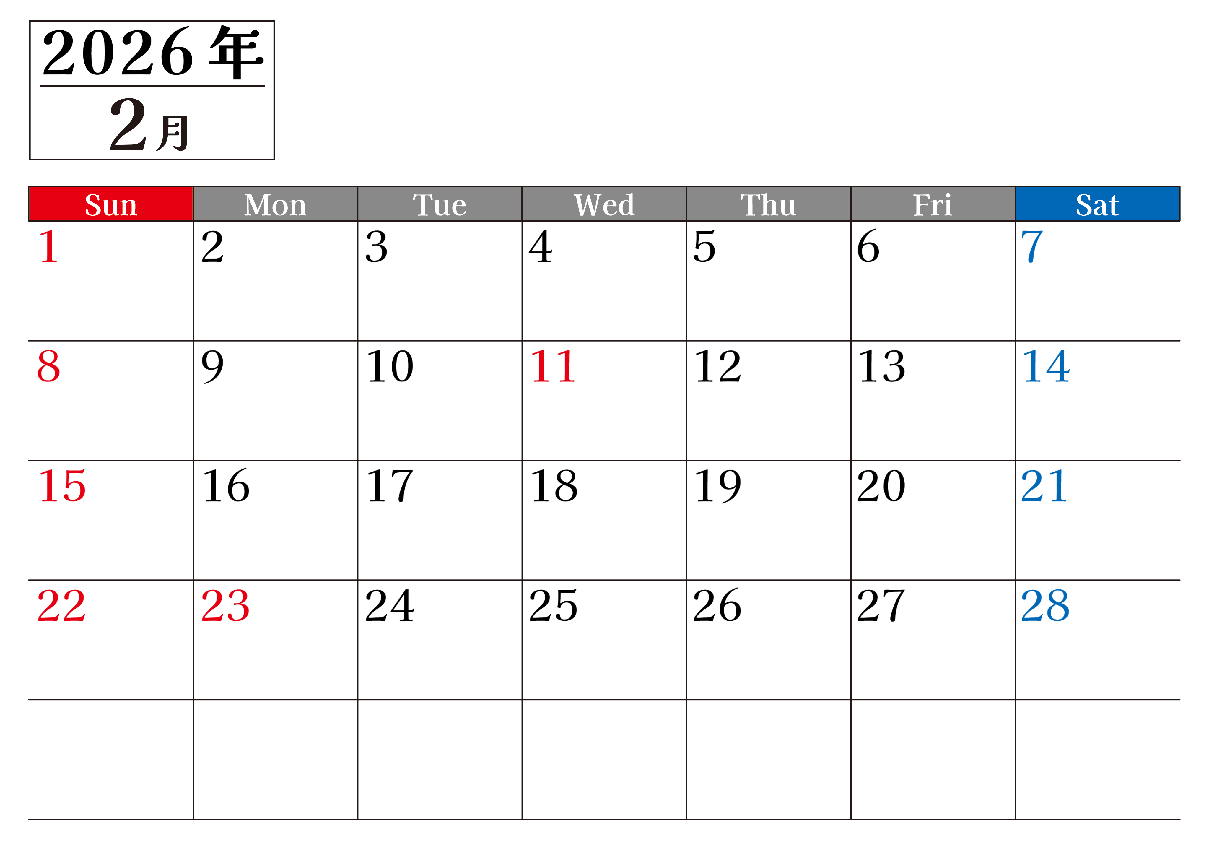 2026年・無料のカレンダーテンプレート 2026年のカレンダー2月横型日曜始まり!書き込みしやすい文字が大きなA4無料シンプルなカレンダー(2026-01200200) 素材状デザイン王 2025年4月8日 2026年のカレンダー2月横型日曜始まりのシンプルで書き込み欄が大きい見やすい!ダウンロードは無料です。A4用紙に印刷してすぐに使えます。忙しいスケジュールを簡単にまとめて書き込みましょう。(2026-01200200) シンプル 2月 横型のカレンダー 日曜始まり カレンダーデザイン-0120