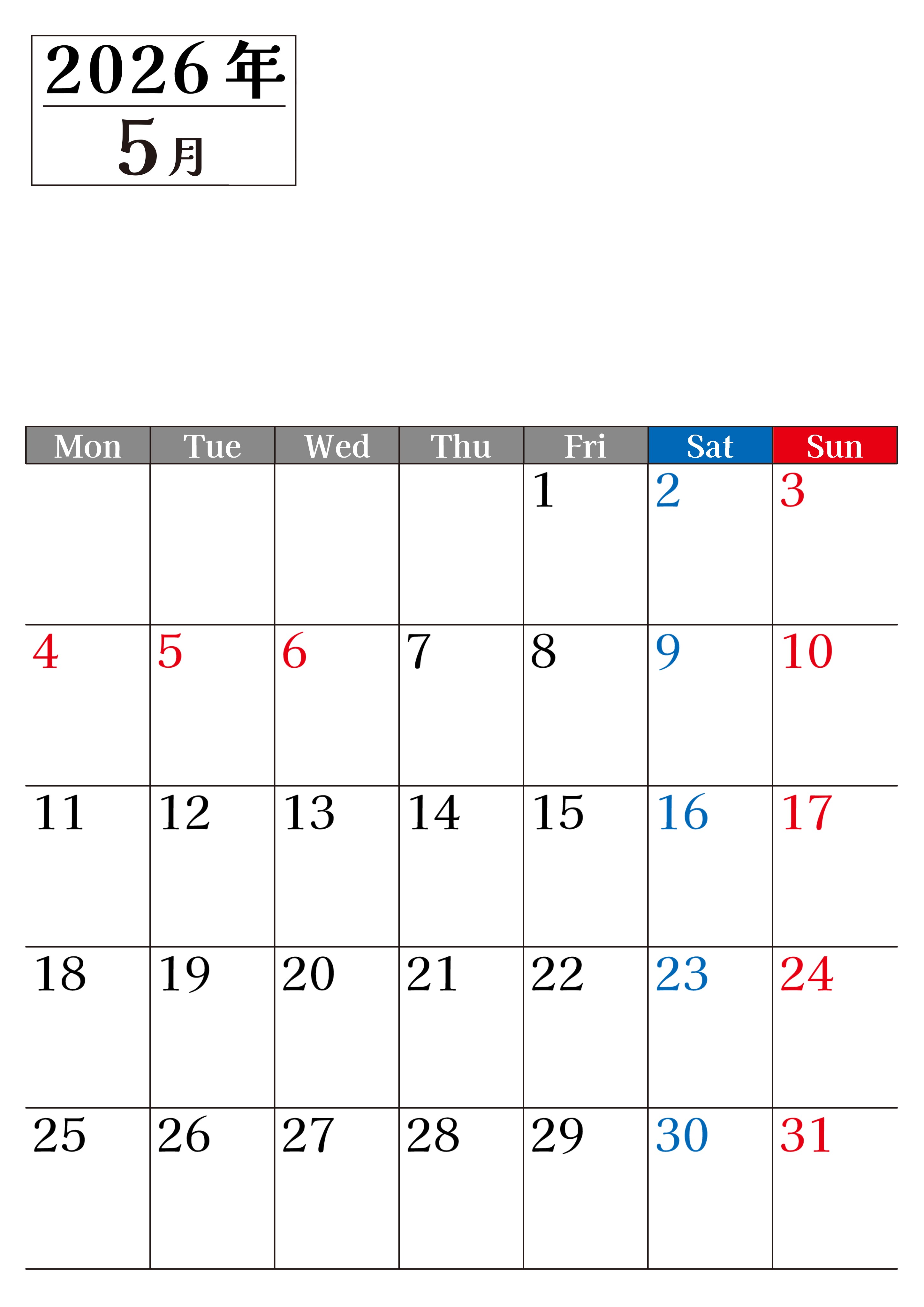 2026年のカレンダー5月縦型月曜始まり!シンプルで書き込み欄が大きい見やすい!ダウンロードは無料(2026-01200511)