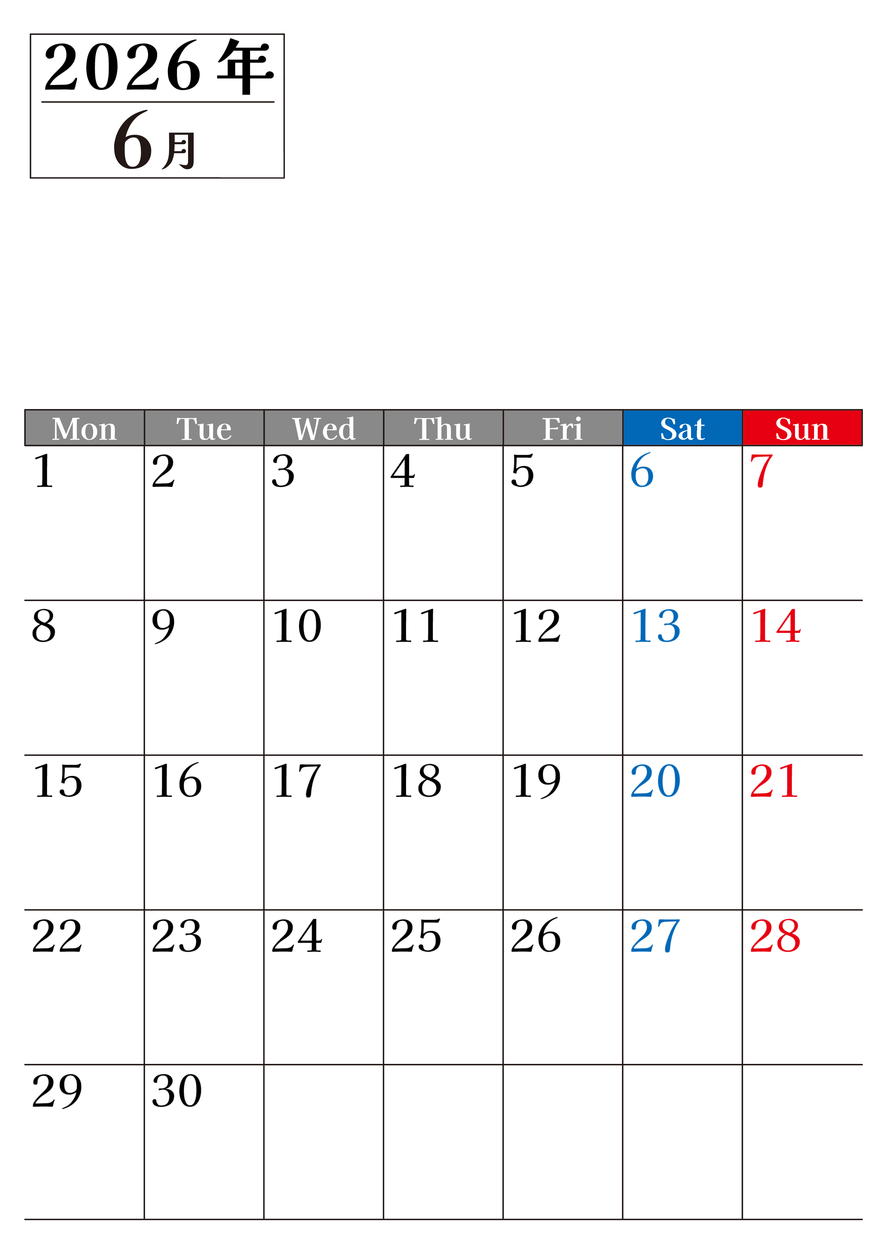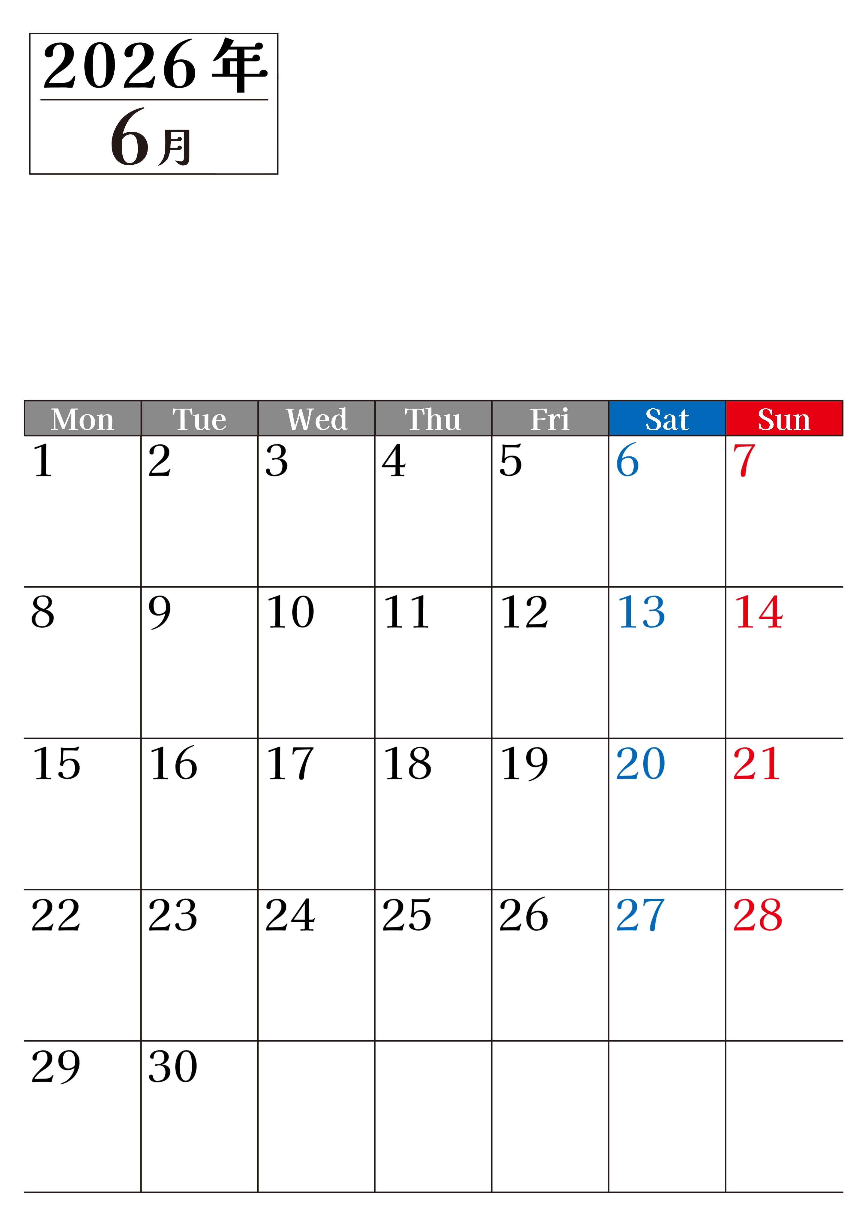 2026年・無料のカレンダーテンプレート 2026年のカレンダー6月縦型月曜始まり!シンプルで書き込み欄が大きい見やすい!ダウンロードは無料(2026-01200611) 素材状デザイン王 2025年4月8日 2026年のカレンダー6月縦型月曜始まりのシンプルで書き込み欄が大きい見やすい!ダウンロードは無料です。A4用紙に印刷してすぐに使えます。多忙なプランの可視化に役立ちます。(2026-01200611) シンプル 6月 縦型のカレンダー 月曜始まり カレンダーデザイン-0120
