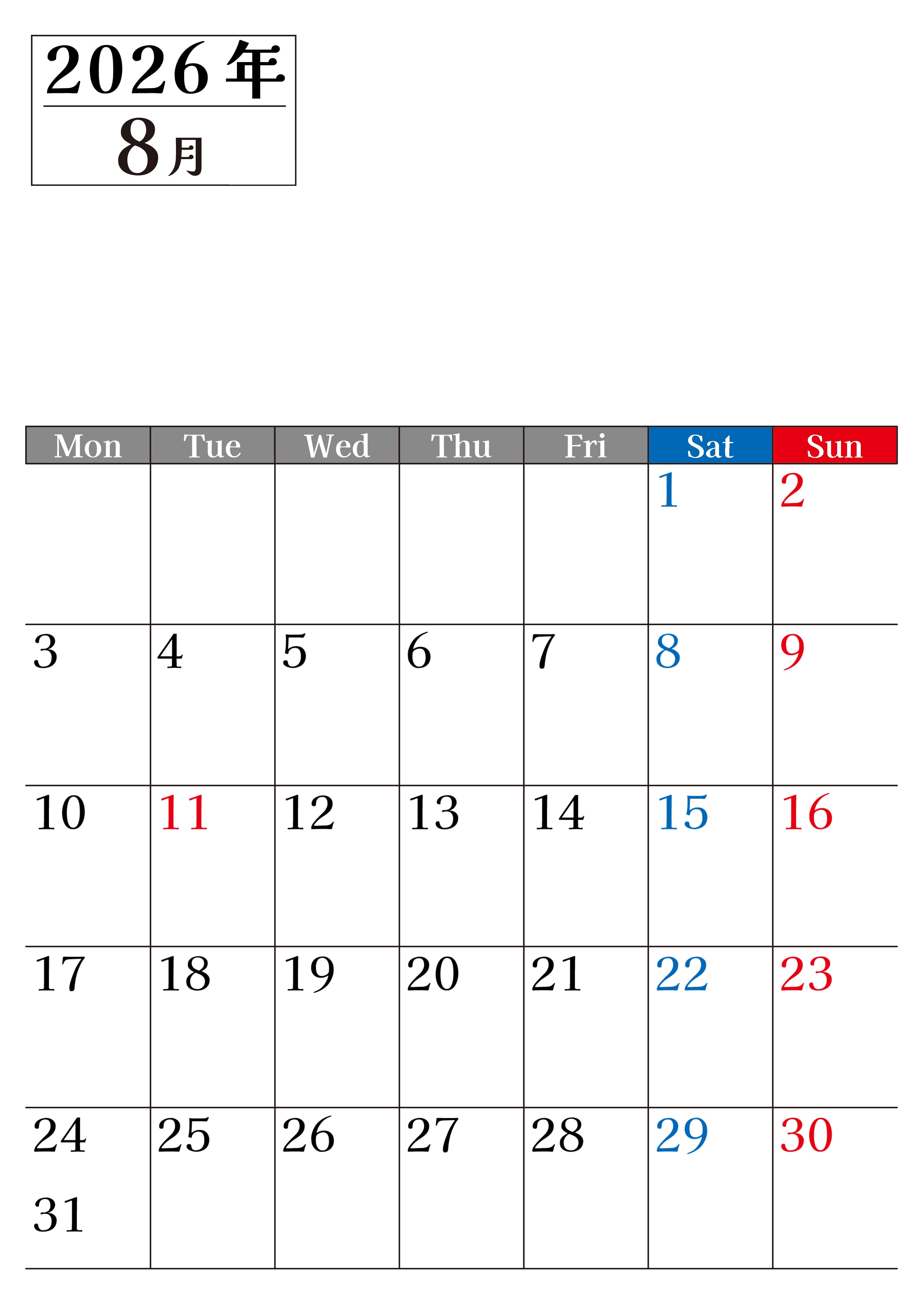 2026年のカレンダー8月縦型月曜始まり!シンプルで書き込み欄が大きい見やすい!ダウンロードは無料(2026-01200811)