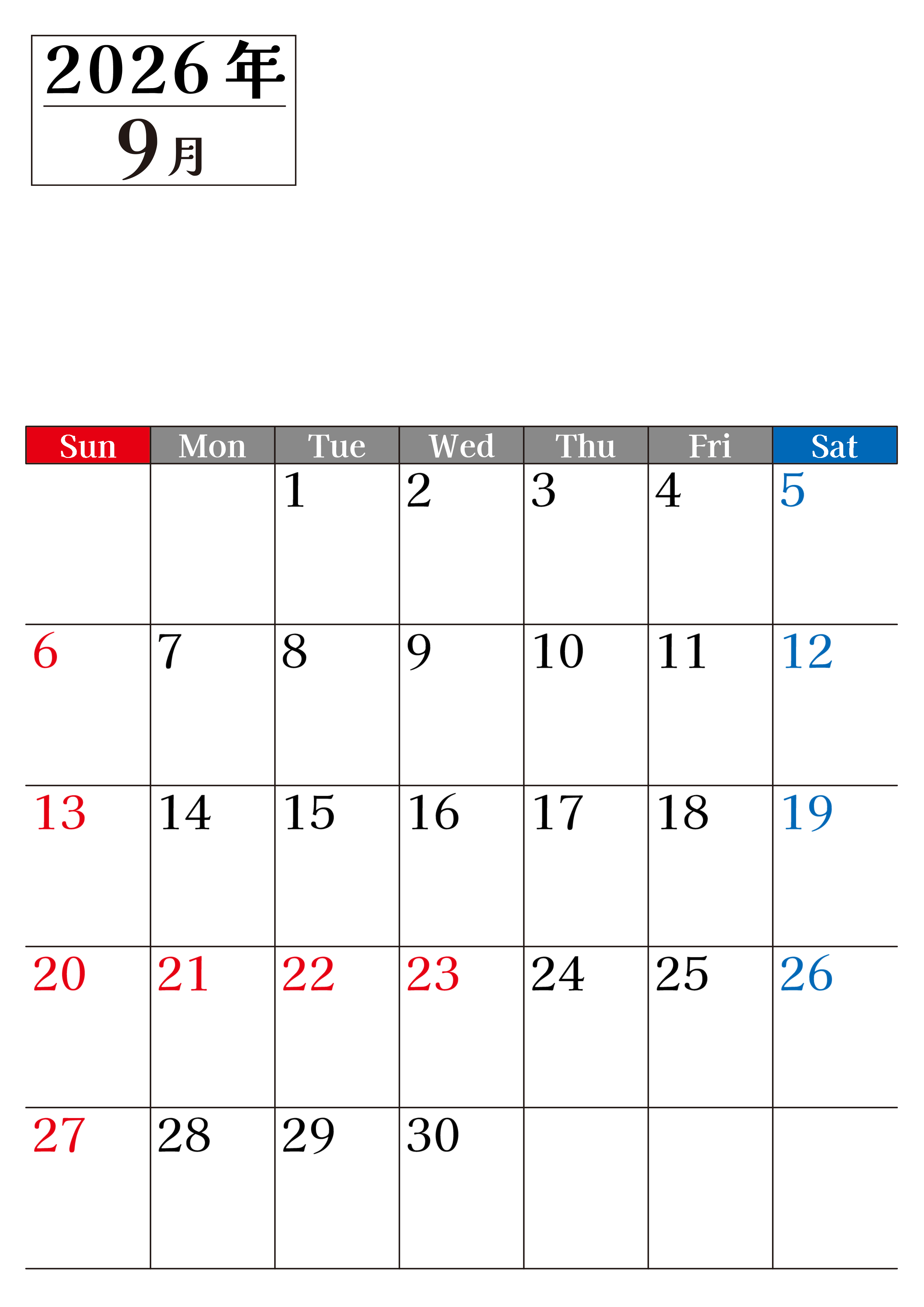 2026年・無料のカレンダーテンプレート 2026年のカレンダー9月縦型日曜始まり!シンプルで書き込み欄が大きい見やすい!ダウンロードは無料(2026-01200910) 素材状デザイン王 2025年4月8日 2026年のカレンダー9月縦型日曜始まりのシンプルで書き込み欄が大きい見やすい!ダウンロードは無料です。A4用紙に印刷してすぐに使えます。多忙なプランの可視化に役立ちます。(2026-01200910) シンプル 9月 縦型のカレンダー 日曜始まり カレンダーデザイン-0120