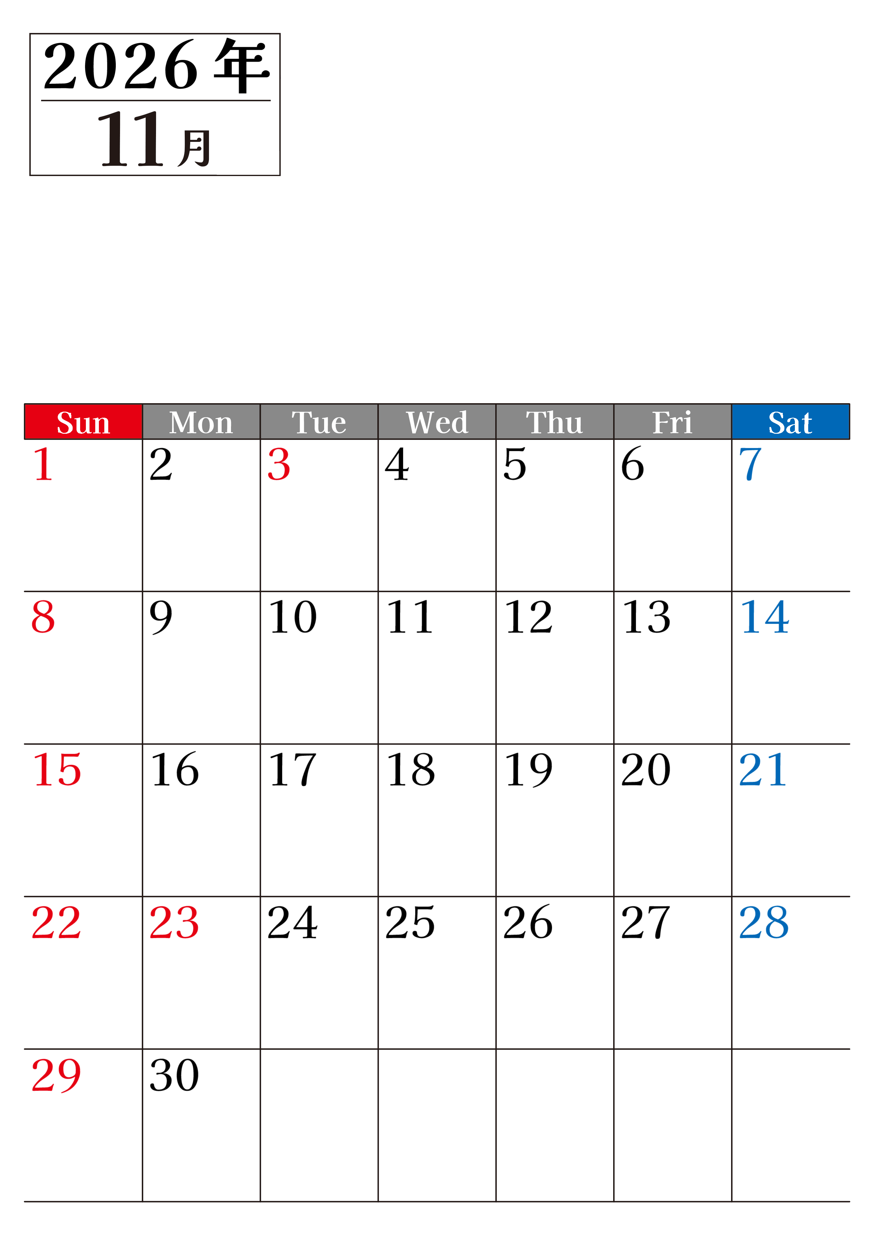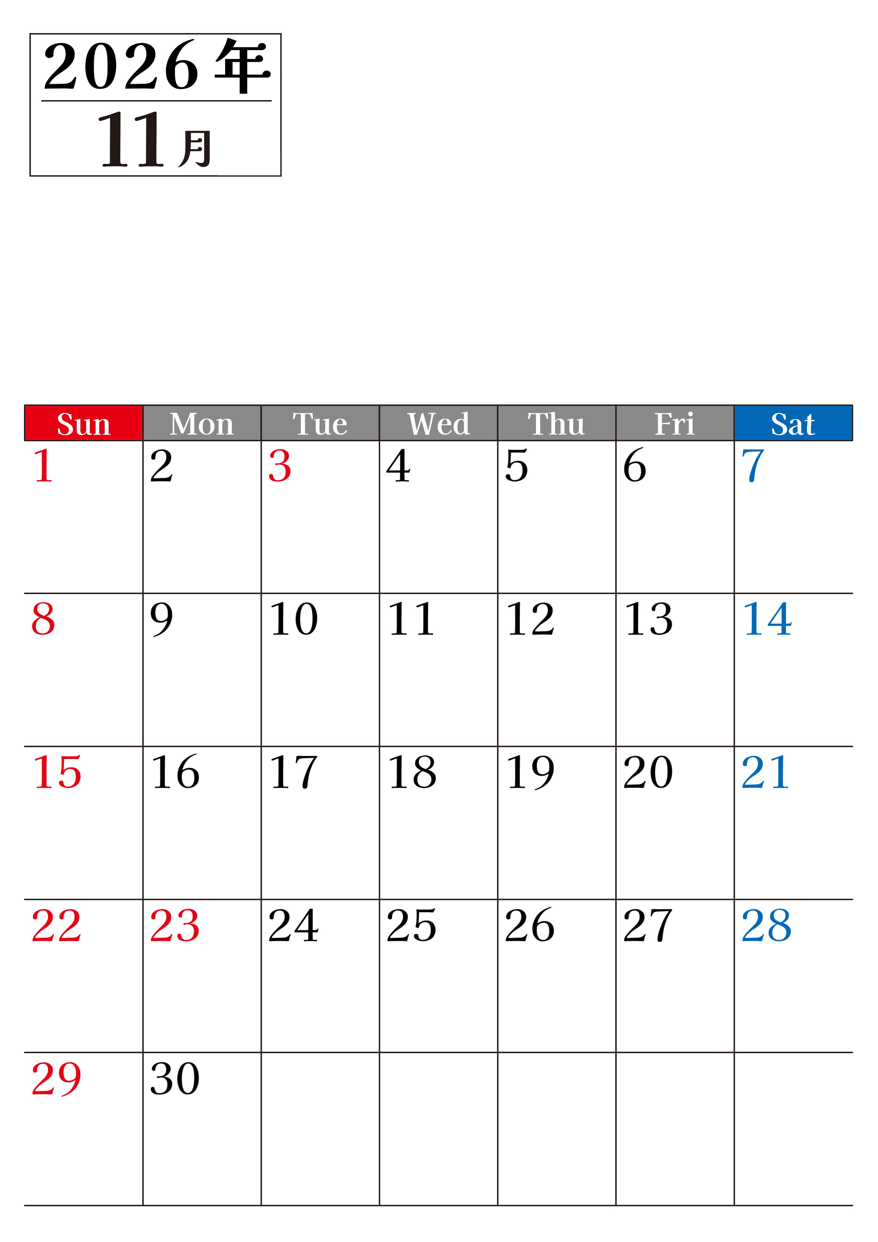 2026年のカレンダー11月縦型日曜始まり!シンプルで書き込み欄が大きい見やすい!ダウンロードは無料(2026-01201110)