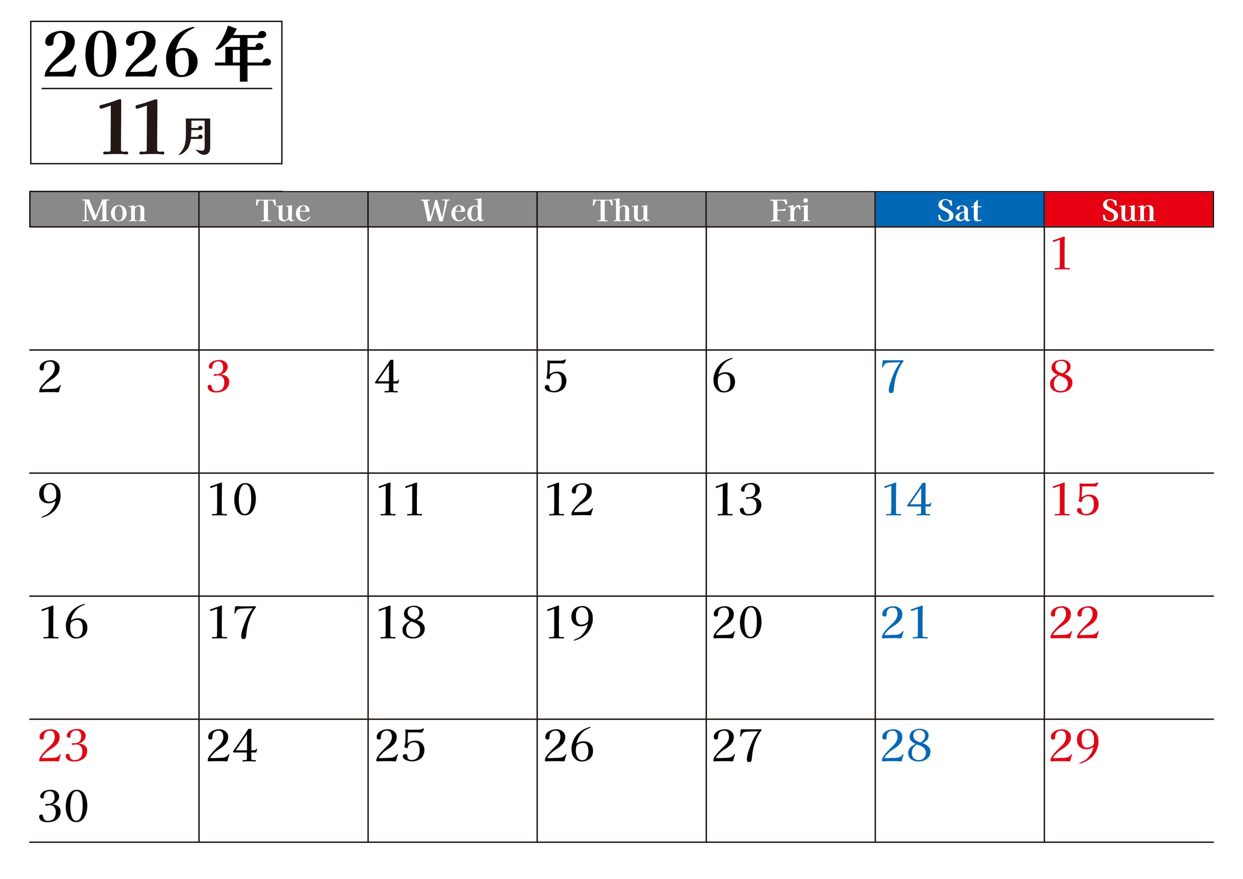 2026年・無料のカレンダーテンプレート 2026年のカレンダー11月横型月曜始まり!シンプルで書き込み欄が大きい見やすい!ダウンロードは無料(2026-01201101) 素材状デザイン王 2025年4月8日 2026年のカレンダー11月横型月曜始まりのシンプルで書き込み欄が大きい見やすい!ダウンロードは無料です。A4用紙に印刷してすぐに使えます。忙しいスケジュールを簡単にまとめて書き込みましょう。(2026-01201101) シンプル 11月 横型のカレンダー 月曜始まり カレンダーデザイン-0120