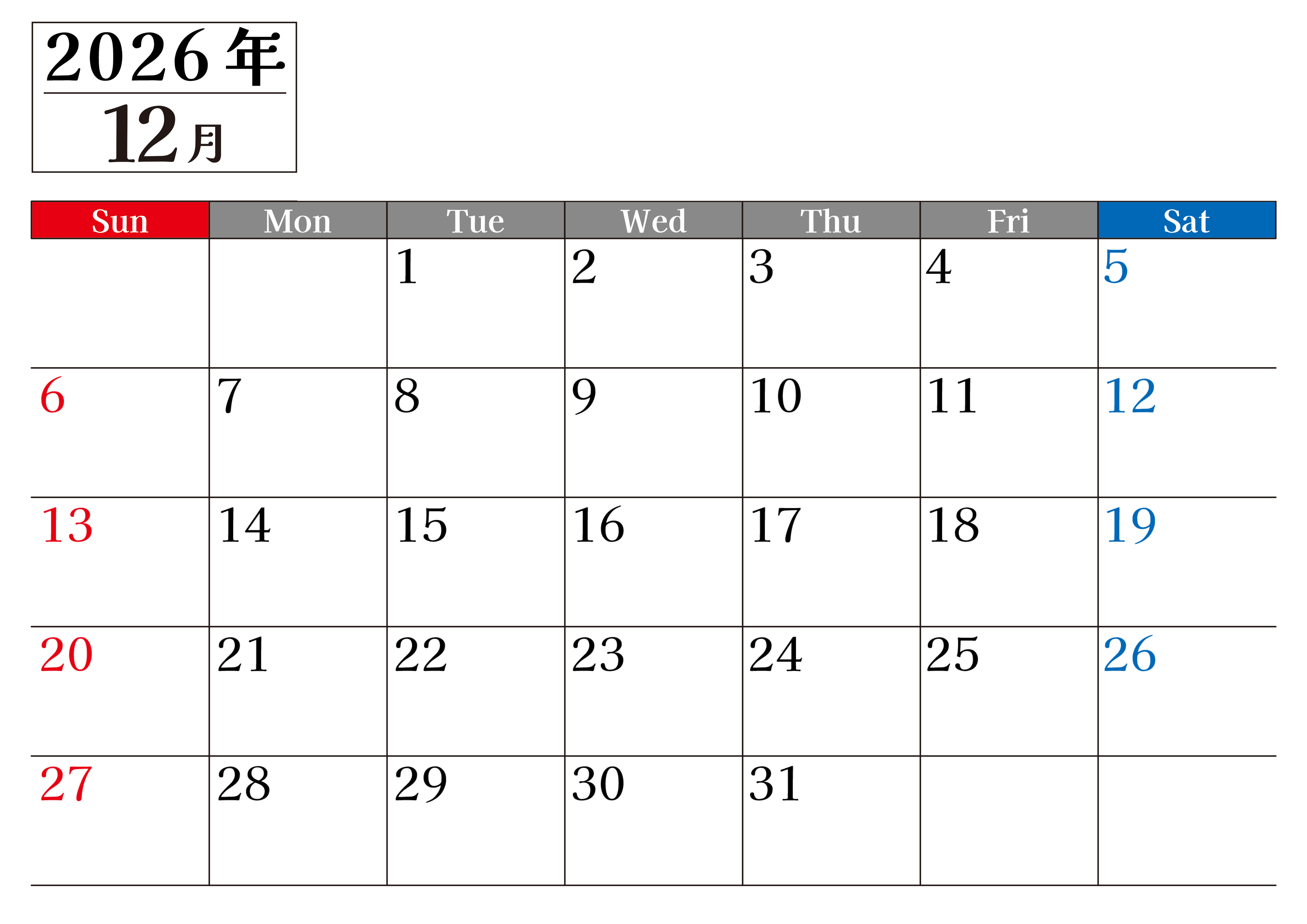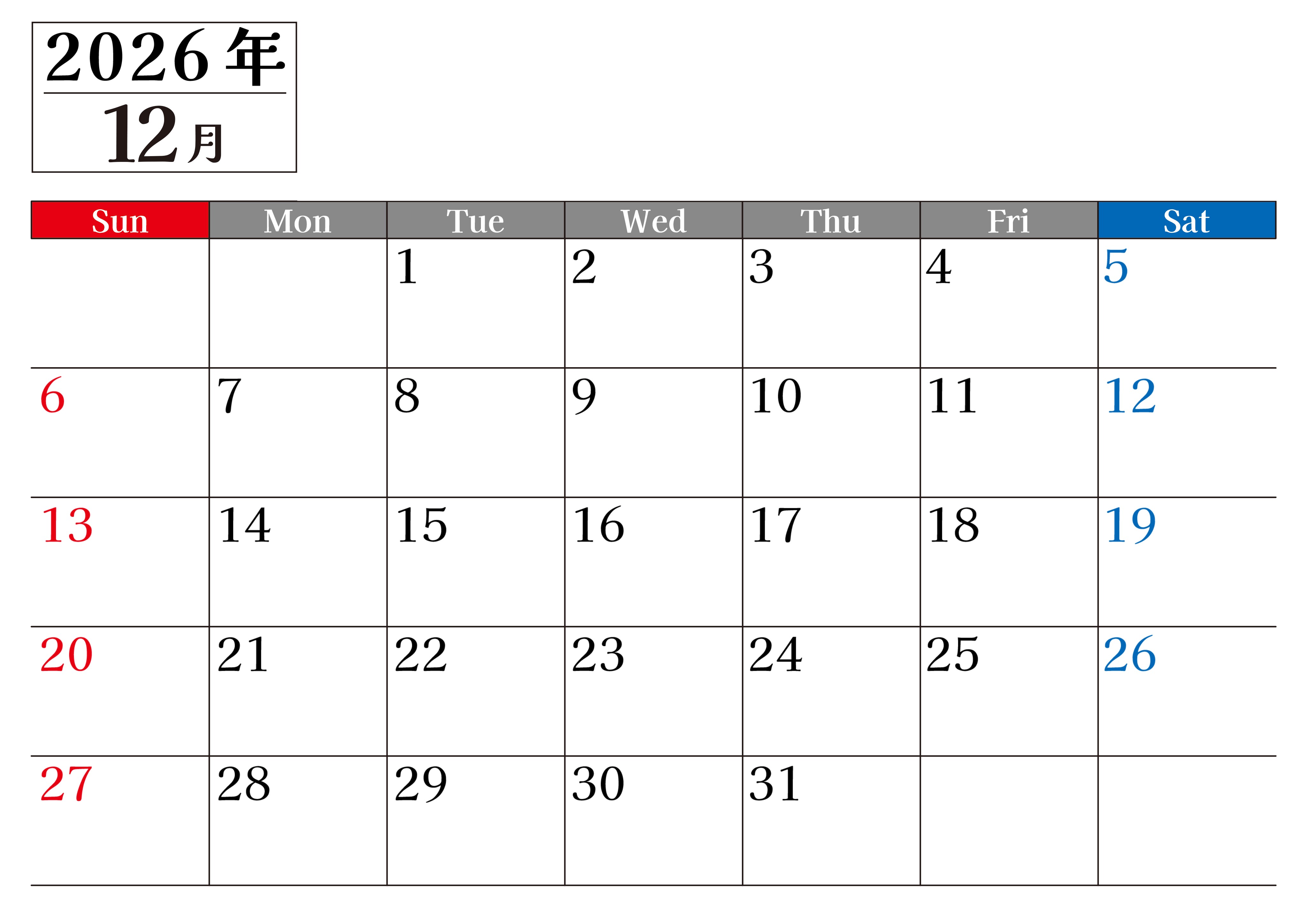 2026年・無料のカレンダーテンプレート 2026年のカレンダー12月横型日曜始まり!シンプルで書き込み欄が大きい見やすい!ダウンロードは無料(2026-01201200) 素材状デザイン王 2025年4月8日 2026年のカレンダー12月横型日曜始まりのシンプルで書き込み欄が大きい見やすい!ダウンロードは無料です。A4用紙に印刷してすぐに使えます。多忙なプランの可視化に役立ちます。(2026-01201200) シンプル 12月 横型のカレンダー 日曜始まり カレンダーデザイン-0120