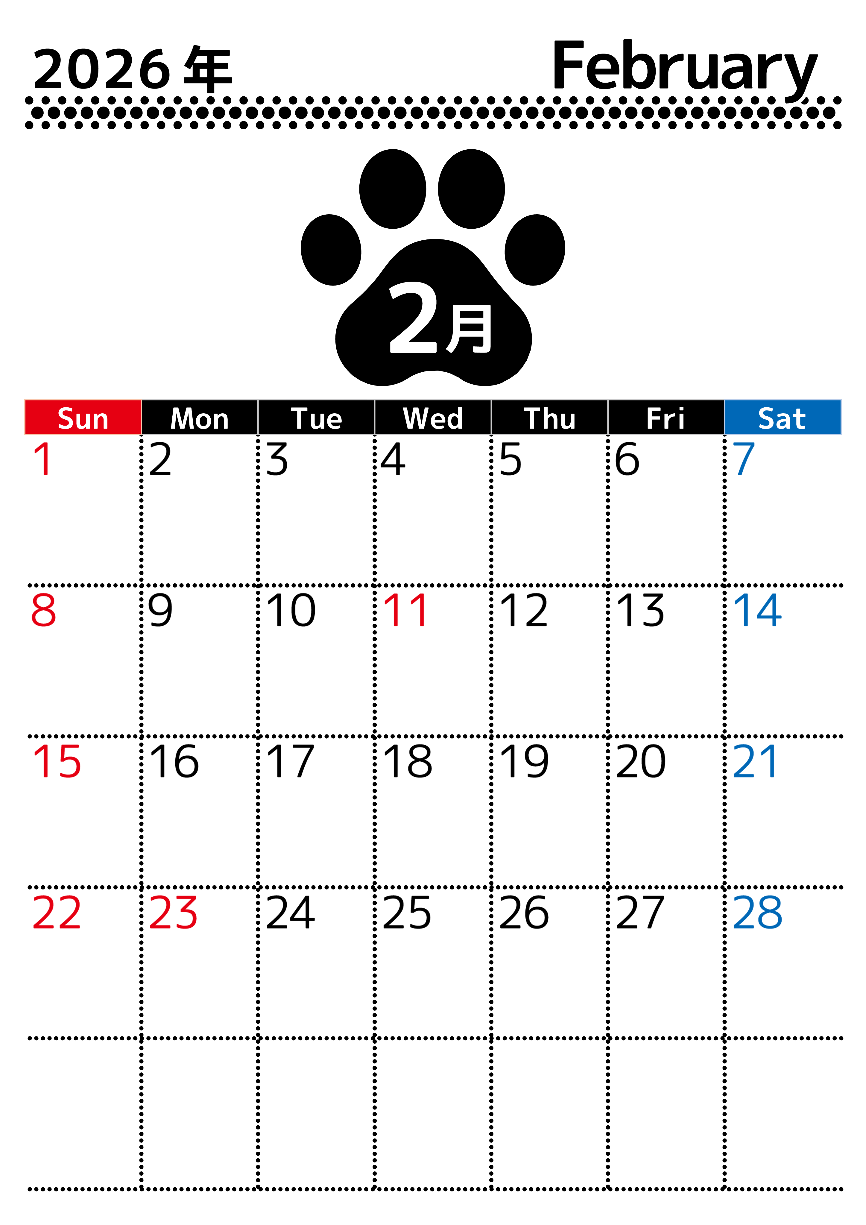 無料カレンダー:2026年2月縦型日曜始まりのシンプルで書き込み欄が大きいのでおすすめです。見やすいのでダウンロードをおすすめします。スケジュールを管理しやすいです。(2026-01210210)