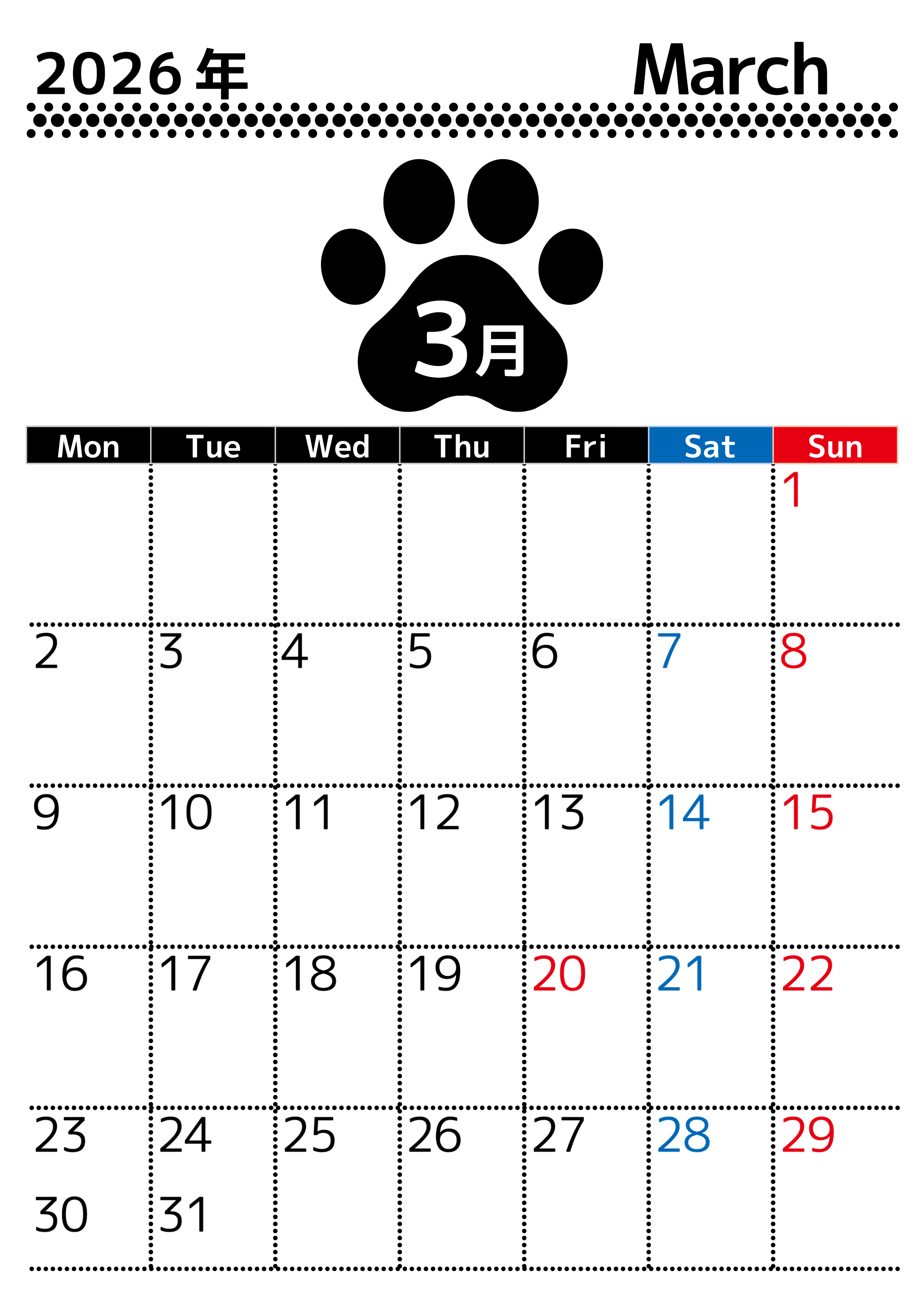 2026年・無料のカレンダーテンプレート 無料カレンダー:2026年3月縦型月曜始まり♪シンプルで書き込み欄が大きいのでおすすめ♪(2026-01210311) 素材状デザイン王 2025年4月8日 無料カレンダー:2026年3月縦型月曜始まりのシンプルで書き込み欄が大きいのでおすすめです。見やすいのでダウンロードをおすすめします。プランの整理にぴったりです。(2026-01210311) シンプル 3月 縦型のカレンダー 月曜始まり カレンダーデザイン-0121