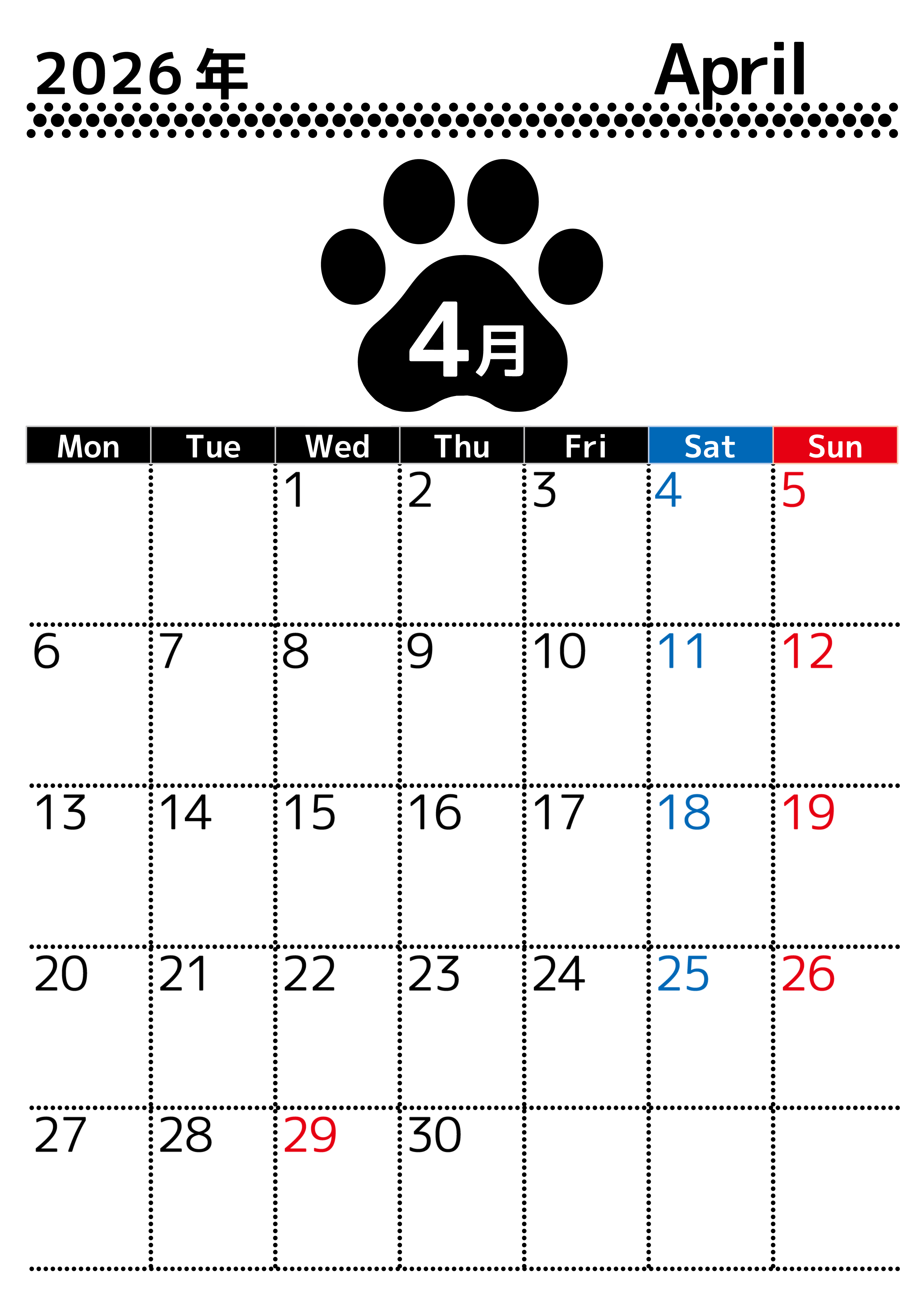 2026年・無料のカレンダーテンプレート 無料カレンダー:2026年4月縦型月曜始まり♪シンプルで書き込み欄が大きいのでおすすめ♪(2026-01210411) 素材状デザイン王 2025年4月8日 無料カレンダー:2026年4月縦型月曜始まりのシンプルで書き込み欄が大きいのでおすすめです。見やすいのでダウンロードをおすすめします。計画を立てるのに最適です。(2026-01210411) シンプル 4月 縦型のカレンダー 月曜始まり カレンダーデザイン-0121