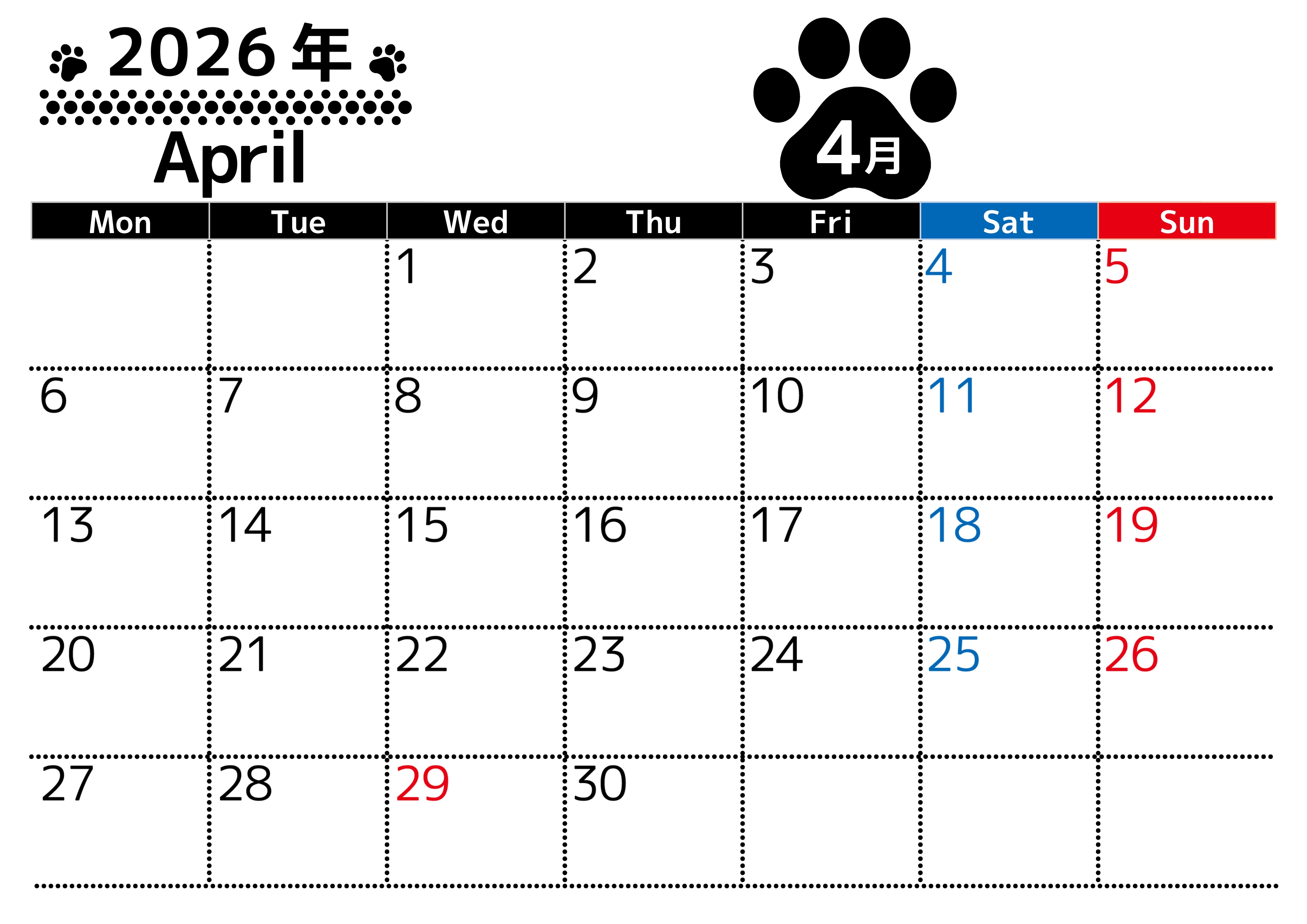 2026年・無料のカレンダーテンプレート 無料カレンダー:2026年4月横型月曜始まり♪シンプルで書き込み欄が大きいのでおすすめ♪(2026-01210401) 素材状デザイン王 2025年4月8日 無料カレンダー:2026年4月横型月曜始まりのシンプルで書き込み欄が大きいのでおすすめです。見やすいのでダウンロードをおすすめします。計画を立てるのに最適です。(2026-01210401) シンプル 4月 横型のカレンダー 月曜始まり カレンダーデザイン-0121