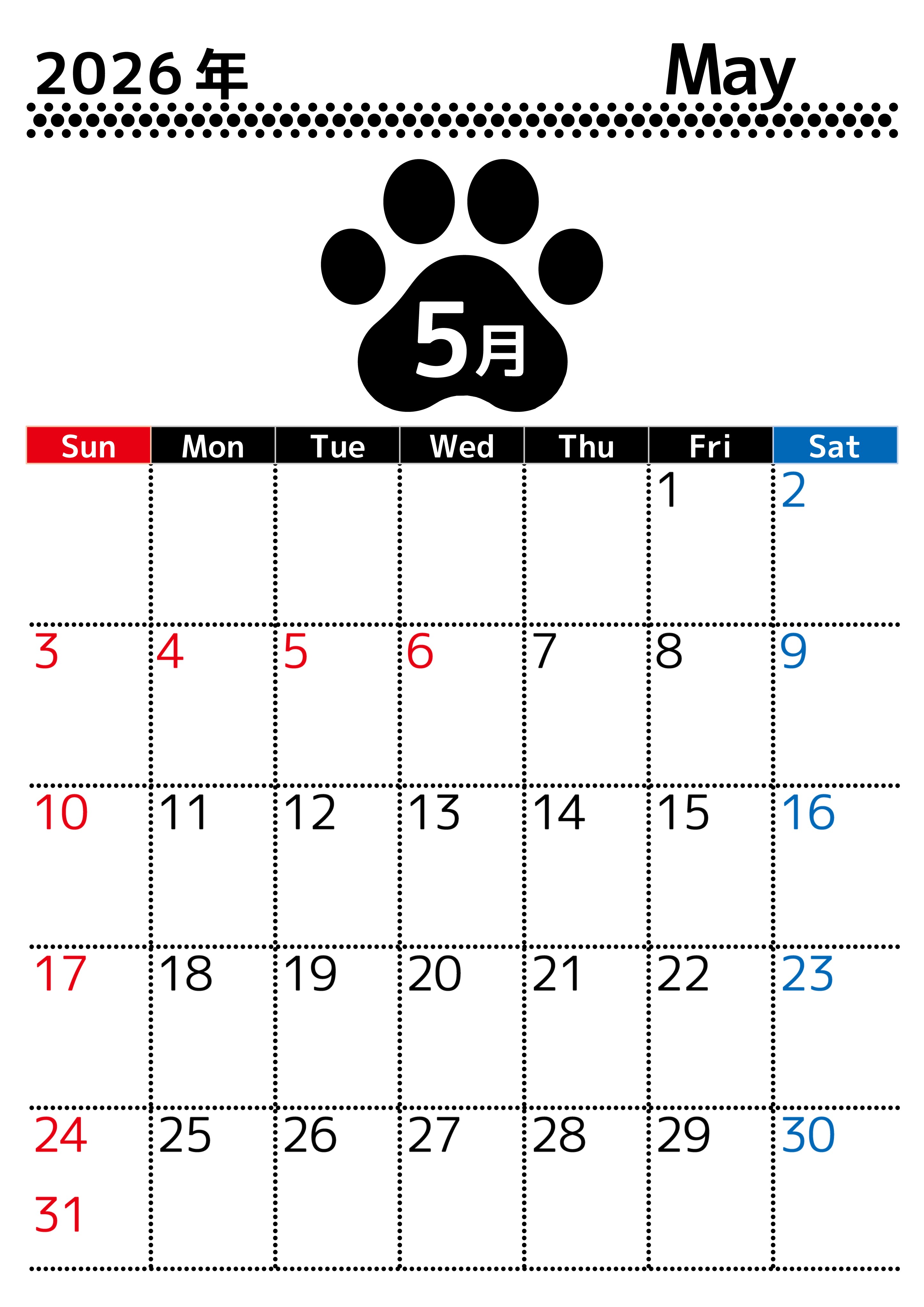 無料カレンダー:2026年5月縦型日曜始まり♪シンプルで書き込み欄が大きいのでおすすめ♪(2026-01210510)