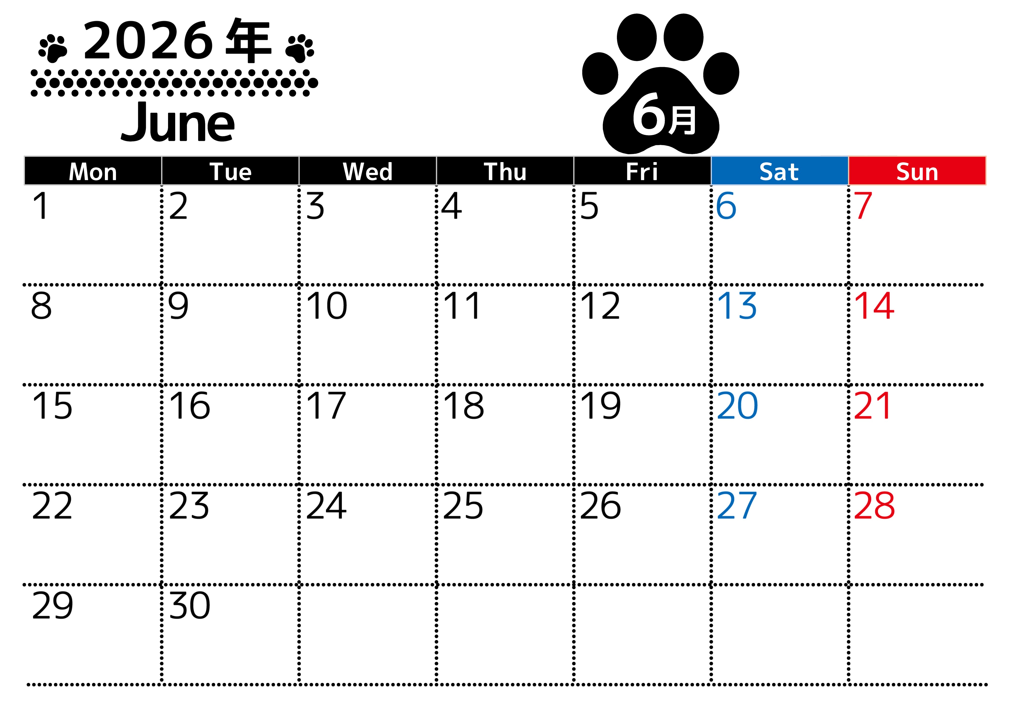 2026年・無料のカレンダーテンプレート 無料カレンダー:2026年6月横型月曜始まり♪シンプルで書き込み欄が大きいのでおすすめ♪(2026-01210601) 素材状デザイン王 2025年4月8日 無料カレンダー:2026年6月横型月曜始まりのシンプルで書き込み欄が大きいのでおすすめです。見やすいのでダウンロードをおすすめします。プランの整理にぴったりです。(2026-01210601) シンプル 6月 横型のカレンダー 月曜始まり カレンダーデザイン-0121