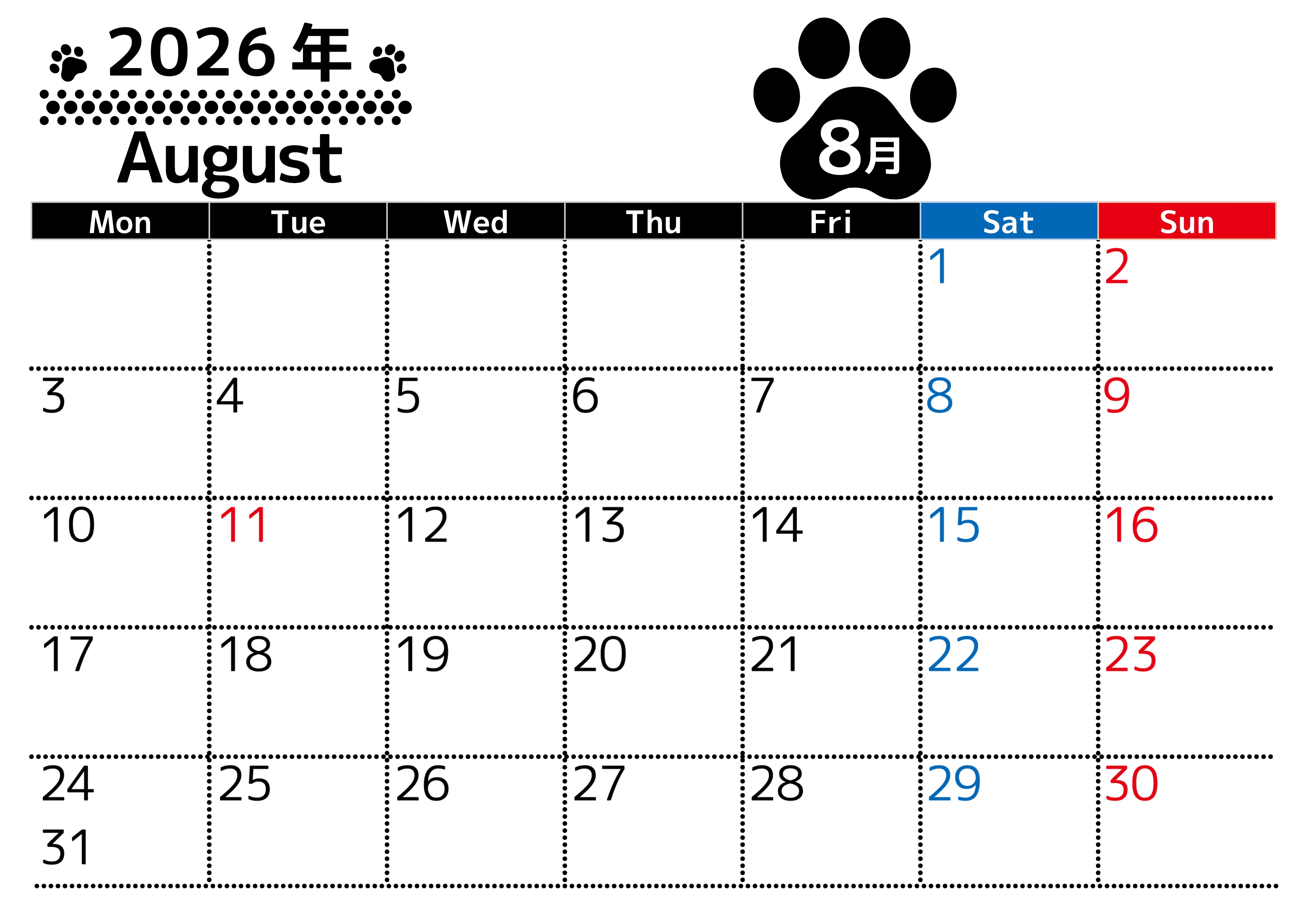 2026年・無料のカレンダーテンプレート 無料カレンダー:2026年8月横型月曜始まり♪シンプルで書き込み欄が大きいのでおすすめ♪(2026-01210801) 素材状デザイン王 2025年4月8日 無料カレンダー:2026年8月横型月曜始まりのシンプルで書き込み欄が大きいのでおすすめです。見やすいのでダウンロードをおすすめします。スケジュールを管理しやすいです。(2026-01210801) シンプル 8月 横型のカレンダー 月曜始まり カレンダーデザイン-0121