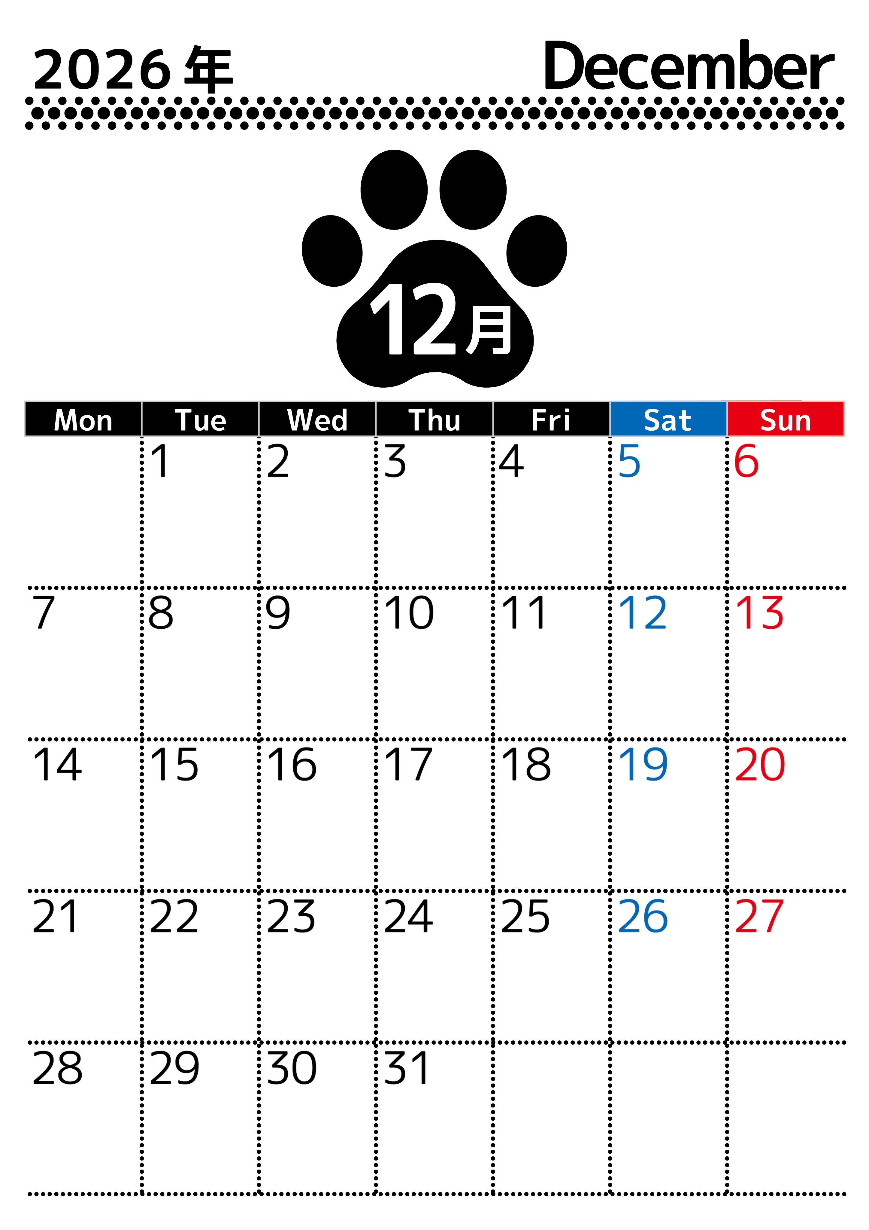 2026年・無料のカレンダーテンプレート 無料カレンダー:2026年12月縦型月曜始まり♪シンプルで書き込み欄が大きいのでおすすめ♪(2026-01211211) 素材状デザイン王 2025年4月8日 無料カレンダー:2026年12月縦型月曜始まりのシンプルで書き込み欄が大きいのでおすすめです。見やすいのでダウンロードをおすすめします。プランの整理にぴったりです。(2026-01211211) シンプル 12月 縦型のカレンダー 月曜始まり カレンダーデザイン-0121