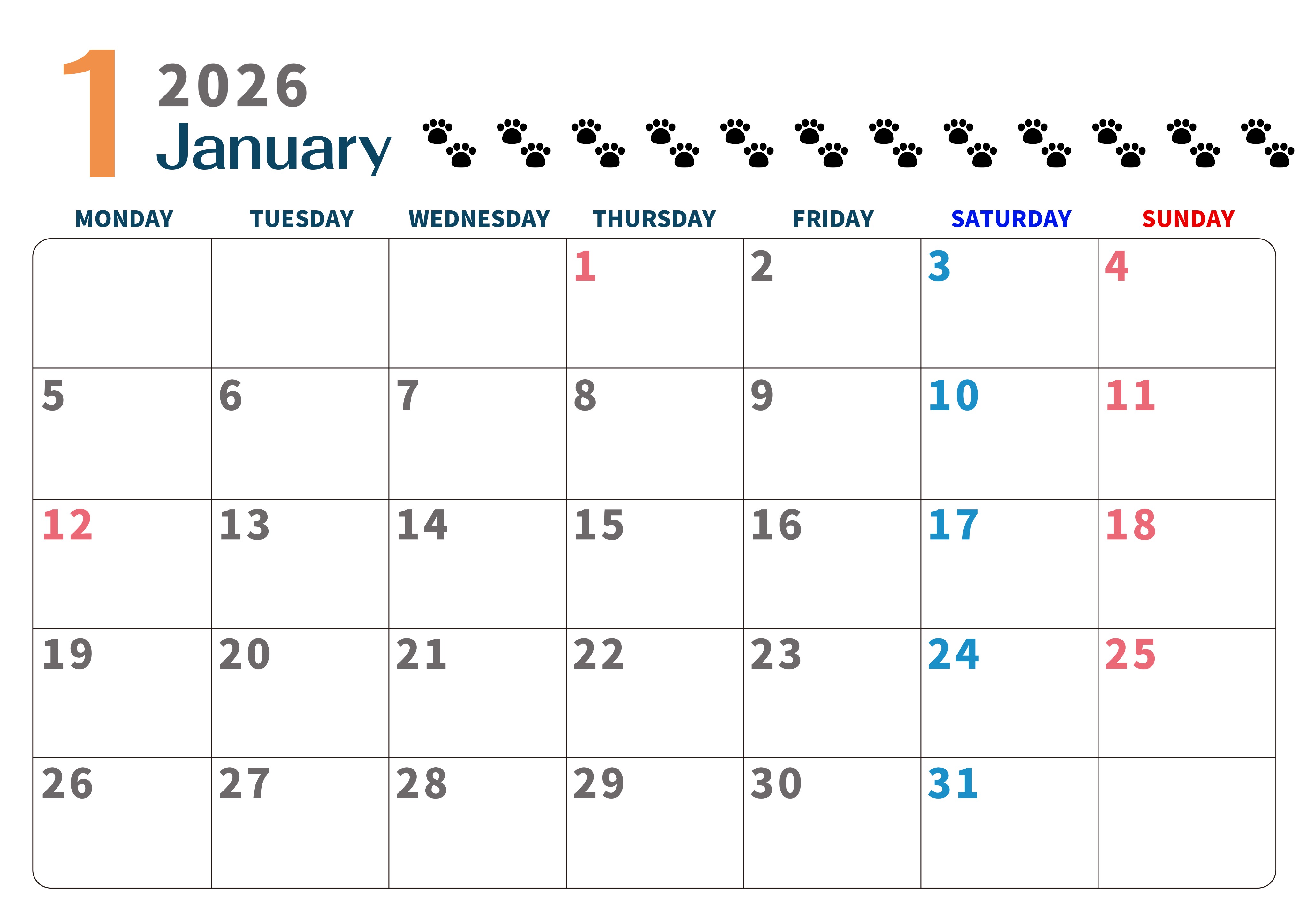 2026年・無料のカレンダーテンプレート 2026年1月カレンダーは横型月曜始まりで猫の黒い肉球がゆるかわいいほっこりするイラストつき無料素材♪(2026-01220101) 素材状デザイン王 2025年4月9日 2026年1月カレンダーは横型月曜始まりで猫の黒い肉球がゆるかわいいほっこりするイラストつき無料素材です。ダウンロードして毎日の癒しアイテムとして壁に貼って使うのをおすすめします♪(2026-01220101) かわいい 1月 猫 横型のカレンダー 月曜始まり カレンダーデザイン-0122