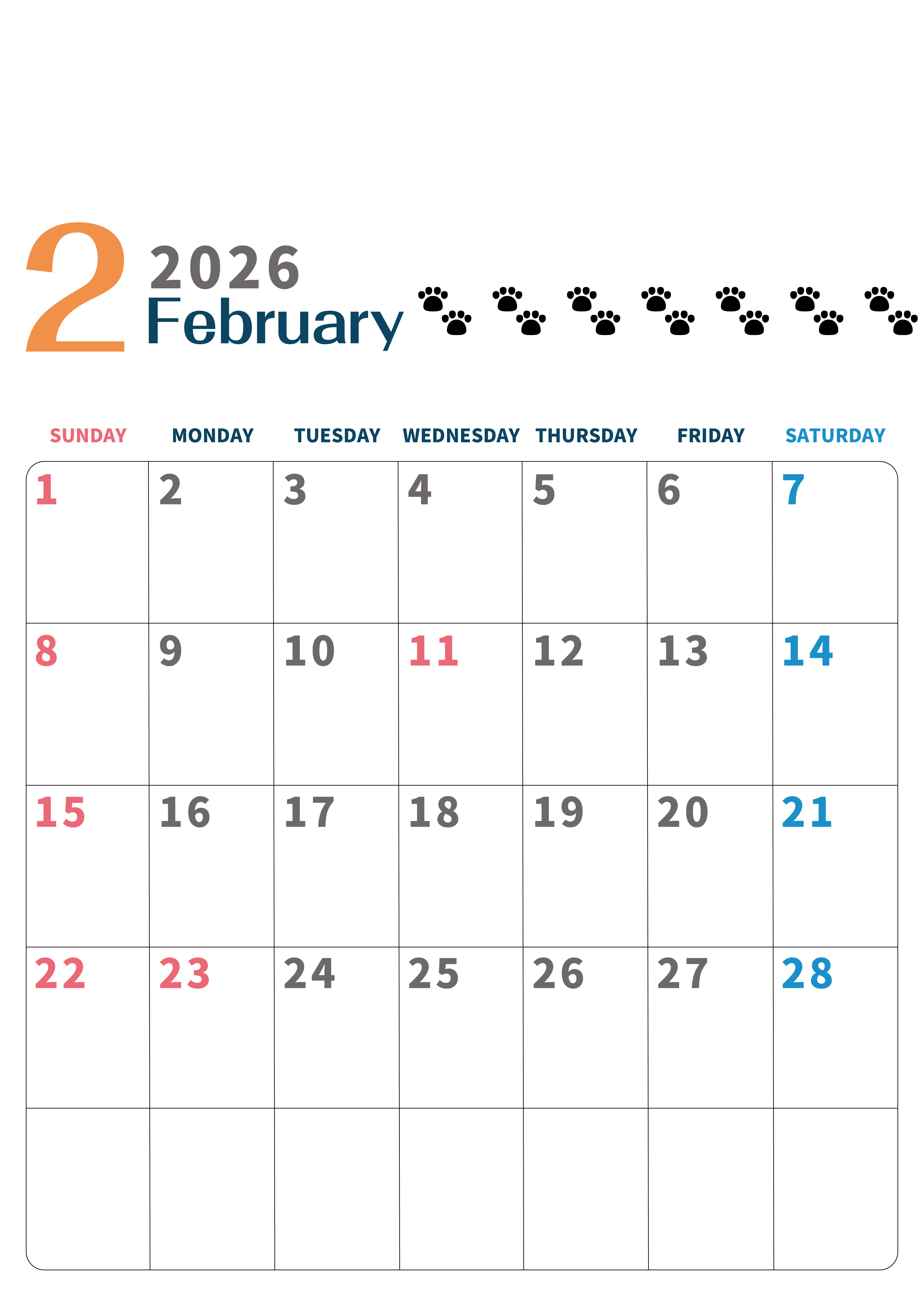 2026年・無料のカレンダーテンプレート 2026年2月カレンダーは縦型日曜始まりで猫の黒い肉球がゆるかわいいほっこりするイラストつき無料素材♪(2026-01220210) 素材状デザイン王 2025年4月9日 2026年2月カレンダーは縦型日曜始まりで猫の黒い肉球がゆるかわいいほっこりするイラストつき無料素材です。ダウンロードして毎日の癒しアイテムとして壁に貼って使うのをおすすめします♪(2026-01220210) かわいい 2月 猫 縦型のカレンダー 日曜始まり カレンダーデザイン-0122