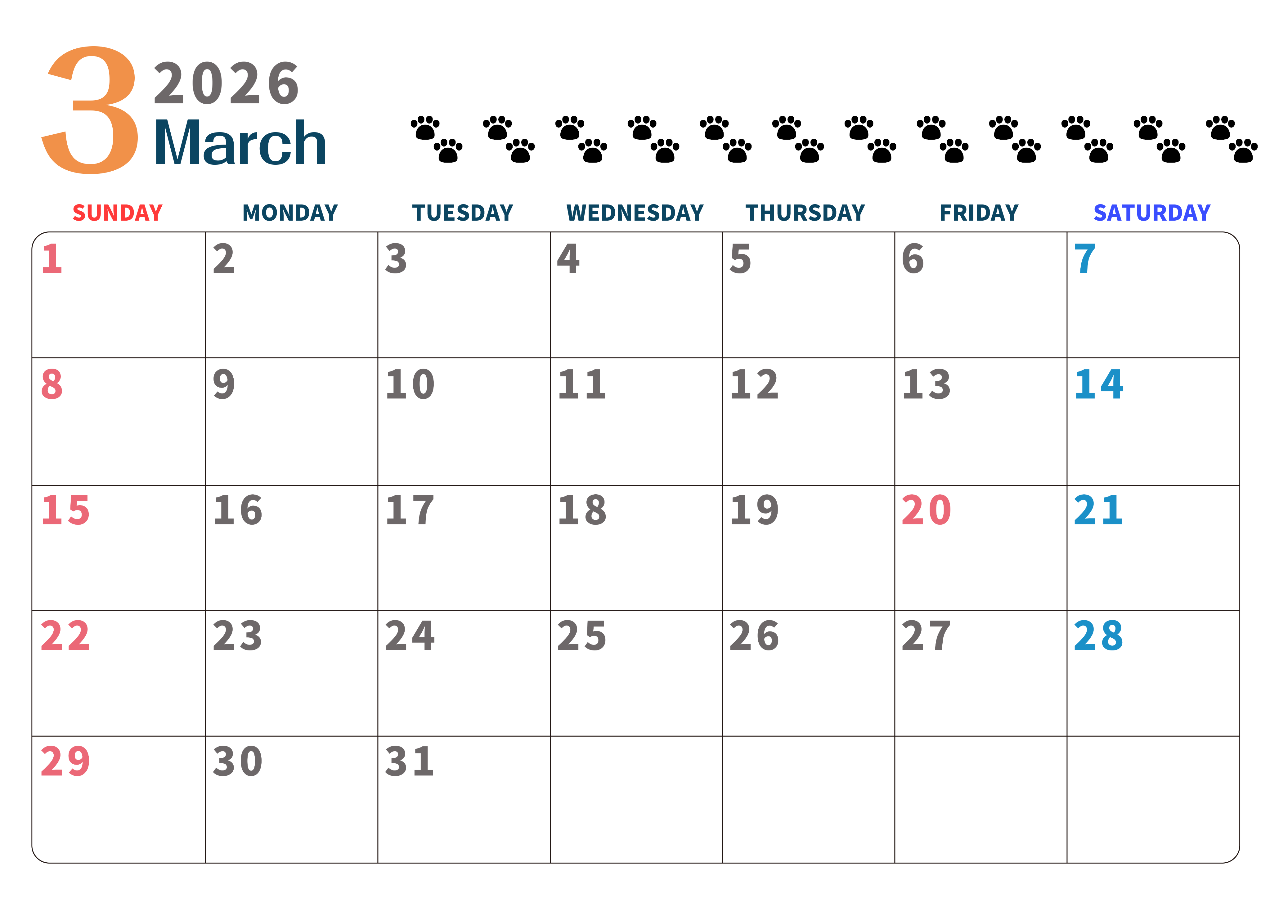 2026年3月カレンダーは横型日曜始まりで猫の黒い肉球がゆるかわいいほっこりするイラストつき無料素材です。ダウンロードして毎日の癒しアイテムとして壁に貼って使うのをおすすめします♪(2026-01220300)