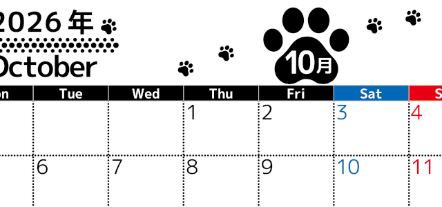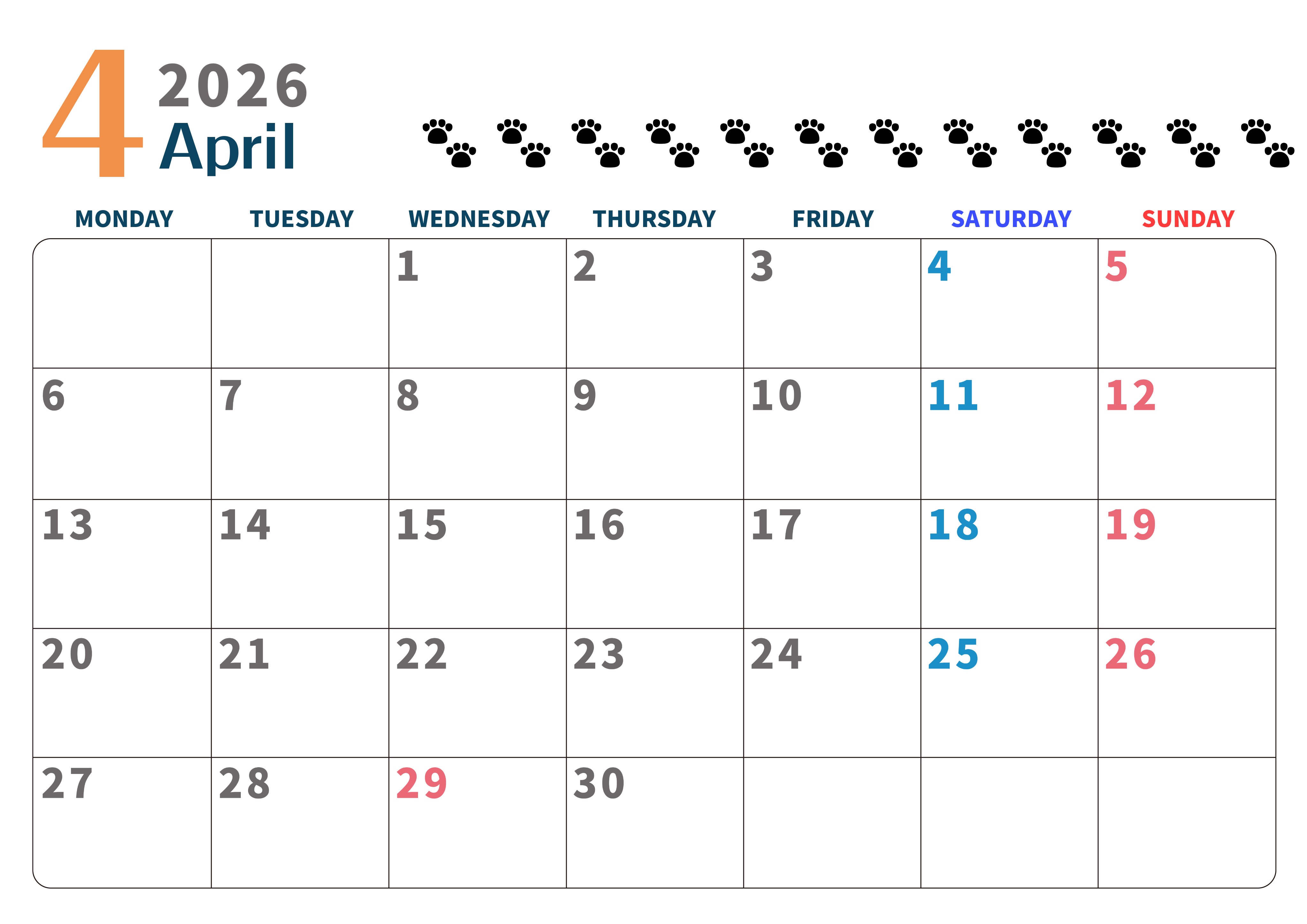 2026年・無料のカレンダーテンプレート 2026年4月カレンダーは横型月曜始まりで猫の黒い肉球がゆるかわいいほっこりするイラストつき無料素材♪(2026-01220401) 素材状デザイン王 2025年4月9日 2026年4月カレンダーは横型月曜始まりで猫の黒い肉球がゆるかわいいほっこりするイラストつき無料素材です。ダウンロードして毎日の癒しアイテムとして壁に貼って使うのをおすすめします♪(2026-01220401) かわいい 4月 猫 横型のカレンダー 月曜始まり カレンダーデザイン-0122