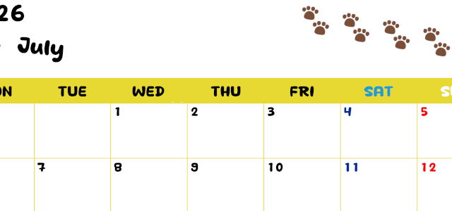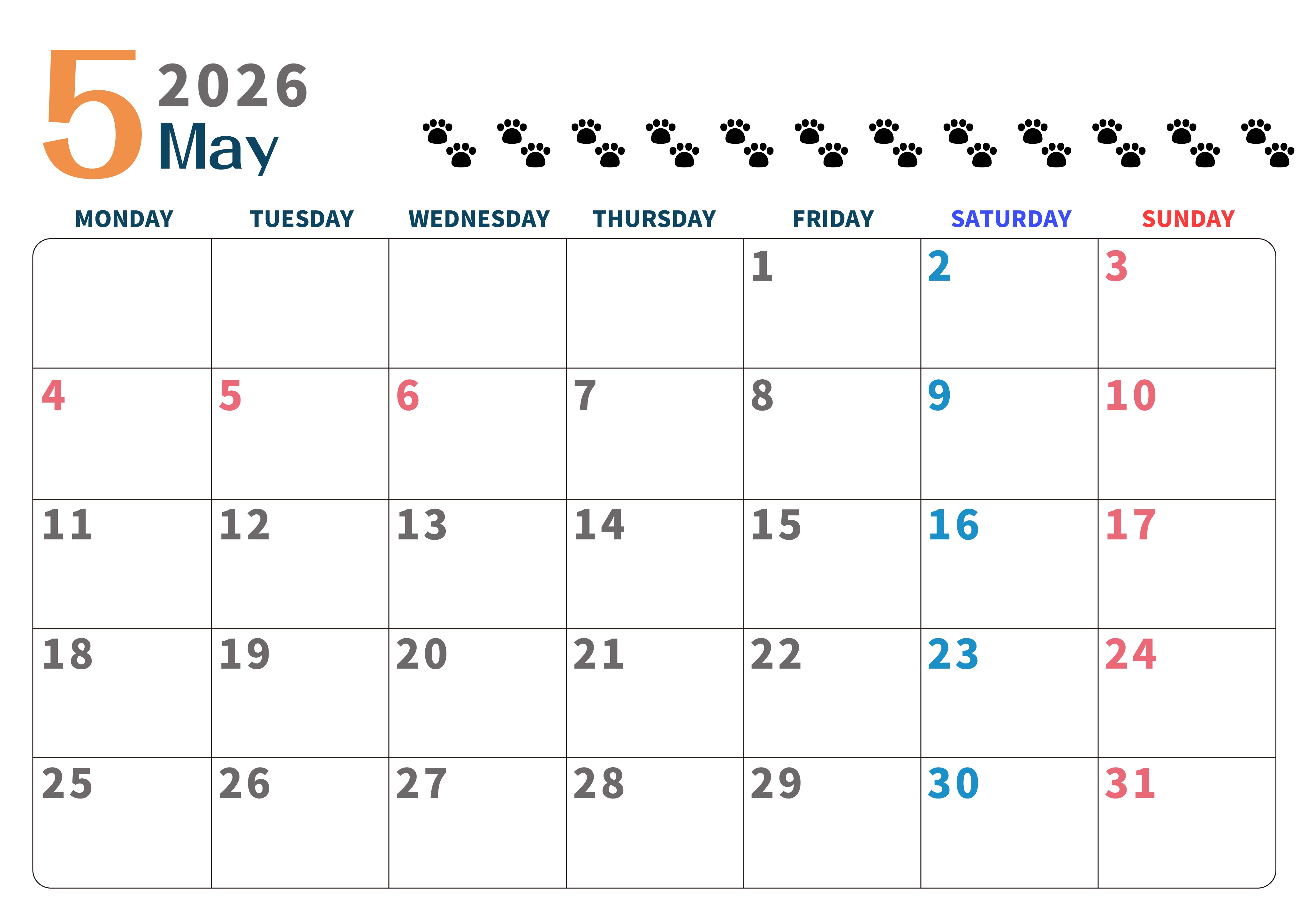 2026年5月カレンダーは横型月曜始まりで猫の黒い肉球がゆるかわいいほっこりするイラストつき無料素材です。ダウンロードして毎日の癒しアイテムとして壁に貼って使うのをおすすめします♪(2026-01220501)